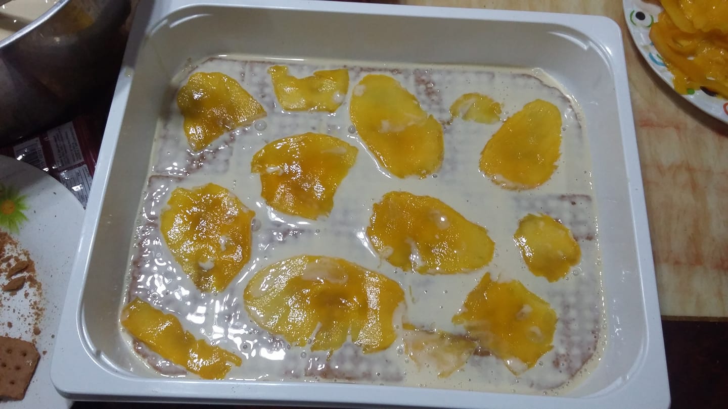- Then add some milk mixtures at the top of the Graham Crackers and place the sliced mangoes.