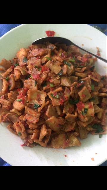 Potong tipis2 tahu putih lalu kemudian goreng sampe agak keras, sambil menggoreng uleg bumbu halusyang sudah disiapkan