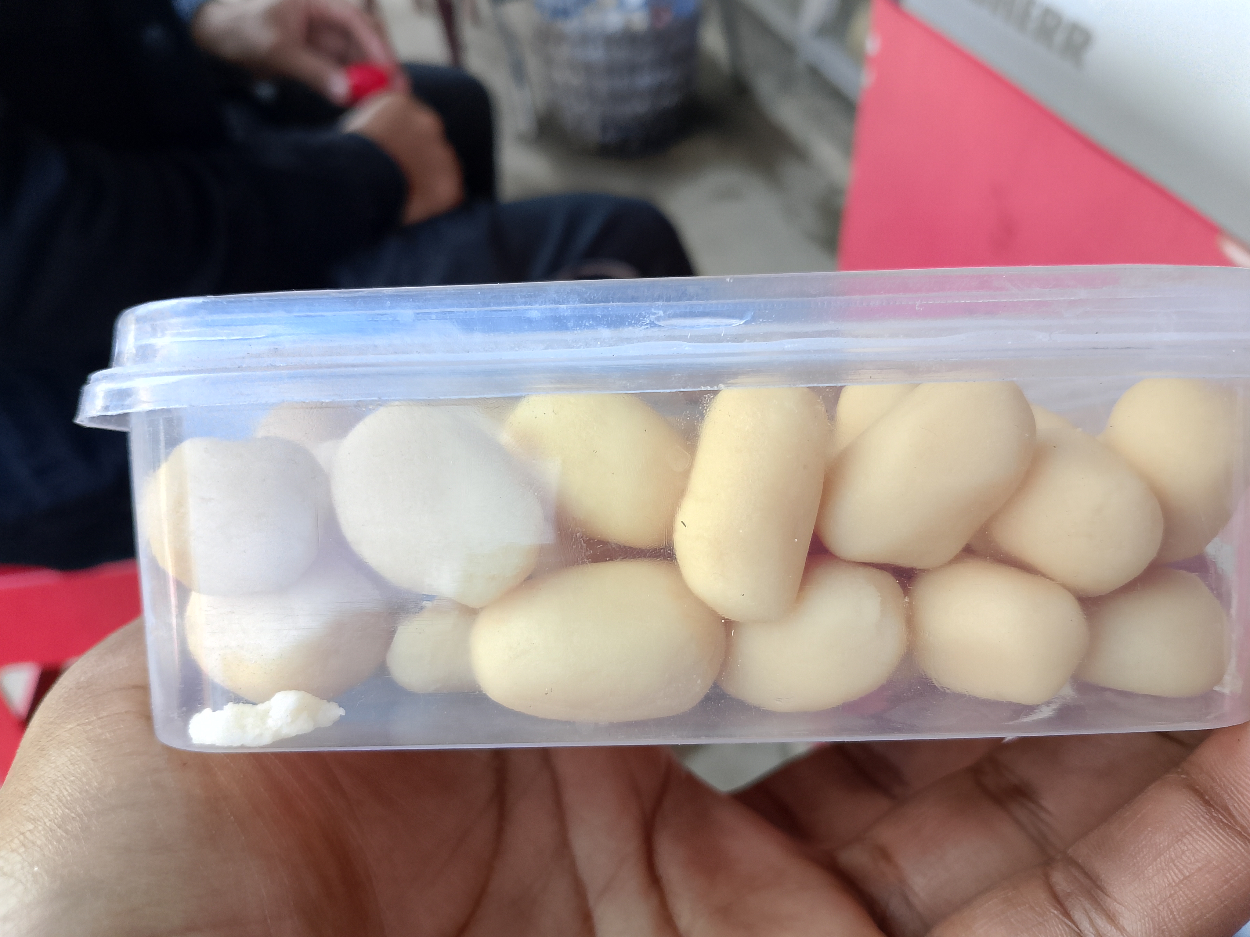 These mini sandesh pieces are prepared and arranged in a container. The container holds a good number of them, as their small size allows many to fit together. The reason for making them small is that they are very sweet, and not everyone prefers or can consume large amounts of sweetness at once.