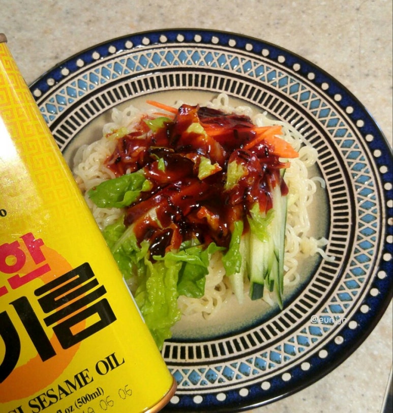 @ ingredients : 1 Paldo bibimmyun, a little cucumber, carrot, green lettuce, sesame oil.
