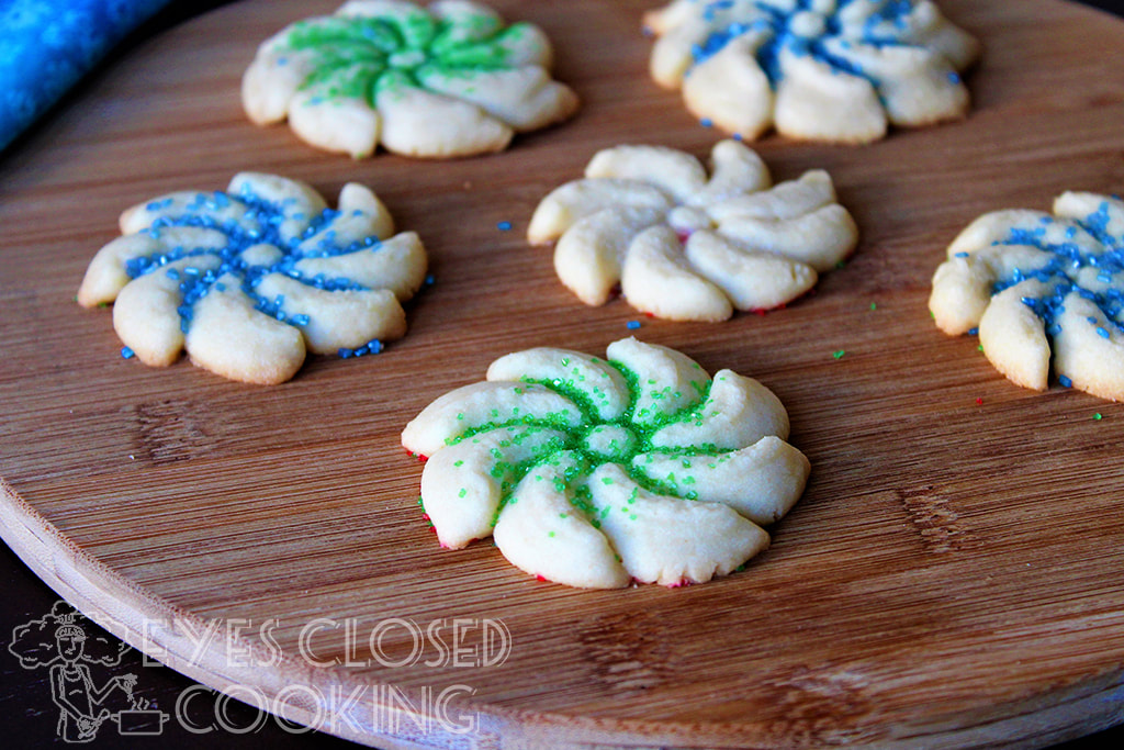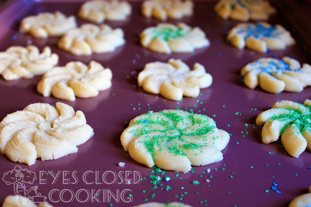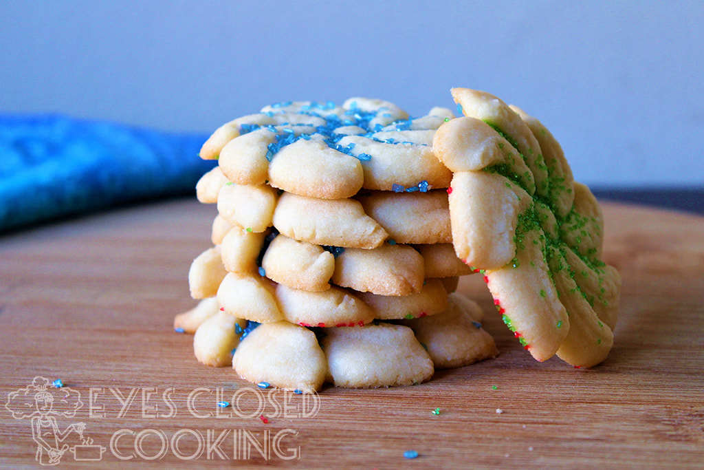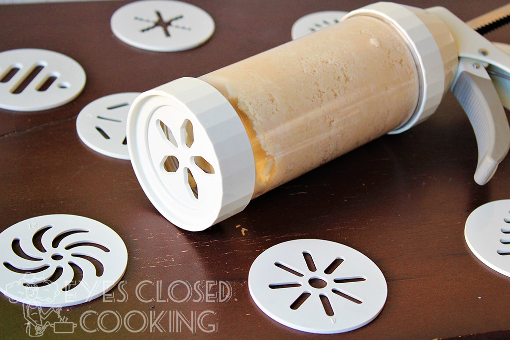 The ingredients for these cookies are very precise. My mom always tells me it took a while for her to find just the right measurements for each ingredient to make sure the texture was perfect for baking. You’ll have to use a Cookie Press Machine (pictured above) so it’s important the dough is not too thick, otherwise it will be very difficult to push through the machine. You can see from the photo below that the dough in this recipe is very light and crumbly looking. Once baked, the cookies have a sweet, buttery flavor that’s extremely addicting. I promise you won’t be able to eat just one.