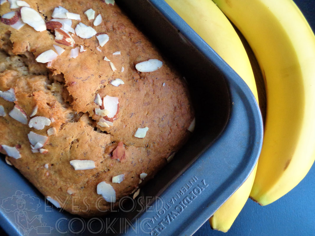 This recipe differs from my Original Banana Bread in the fact that I replaced eggs with applesauce, added a little apple cider vinegar, used regular flour instead of wheat and oats, and removed the chocolate chips (I was pretty sad about that last part).