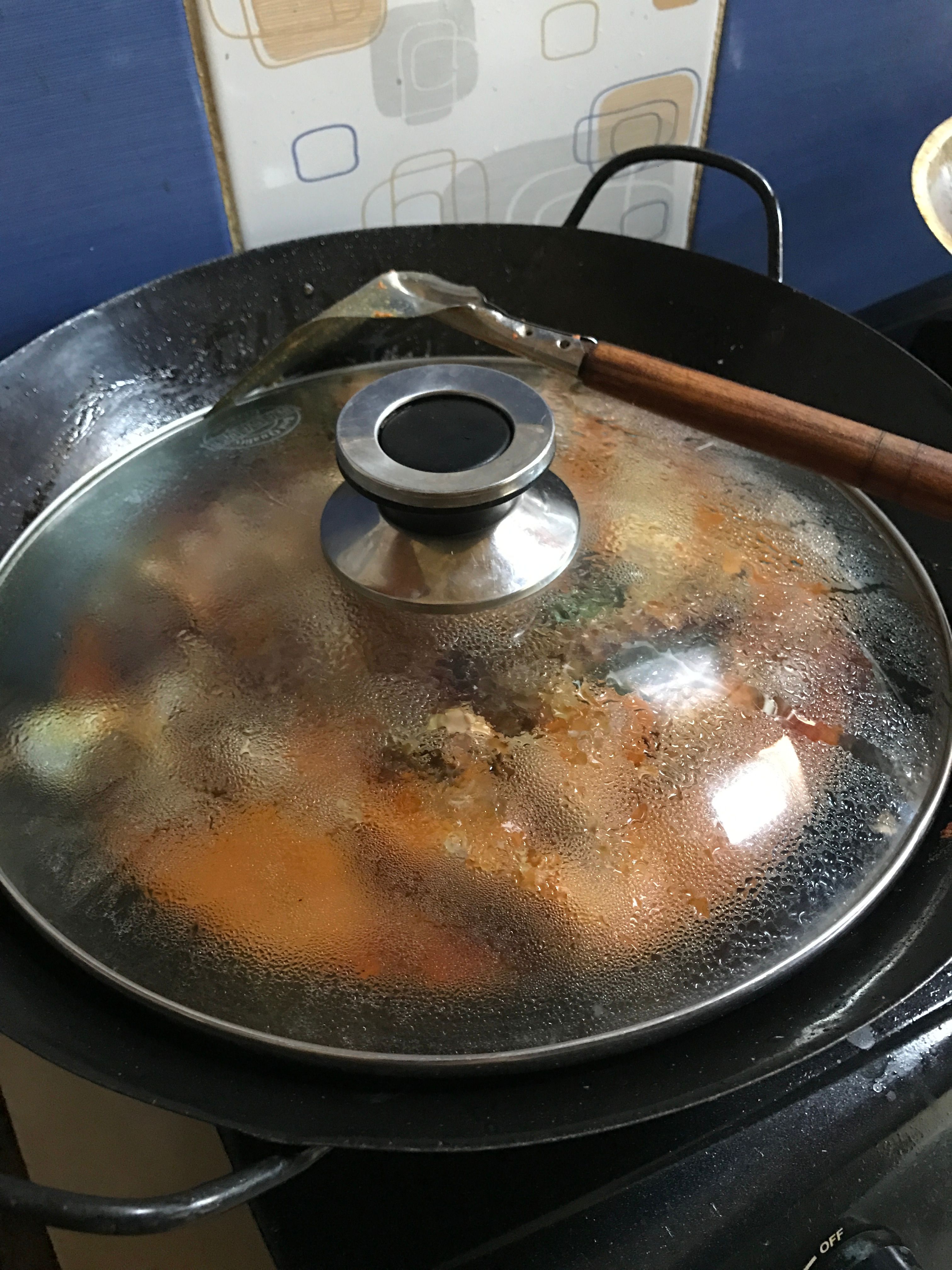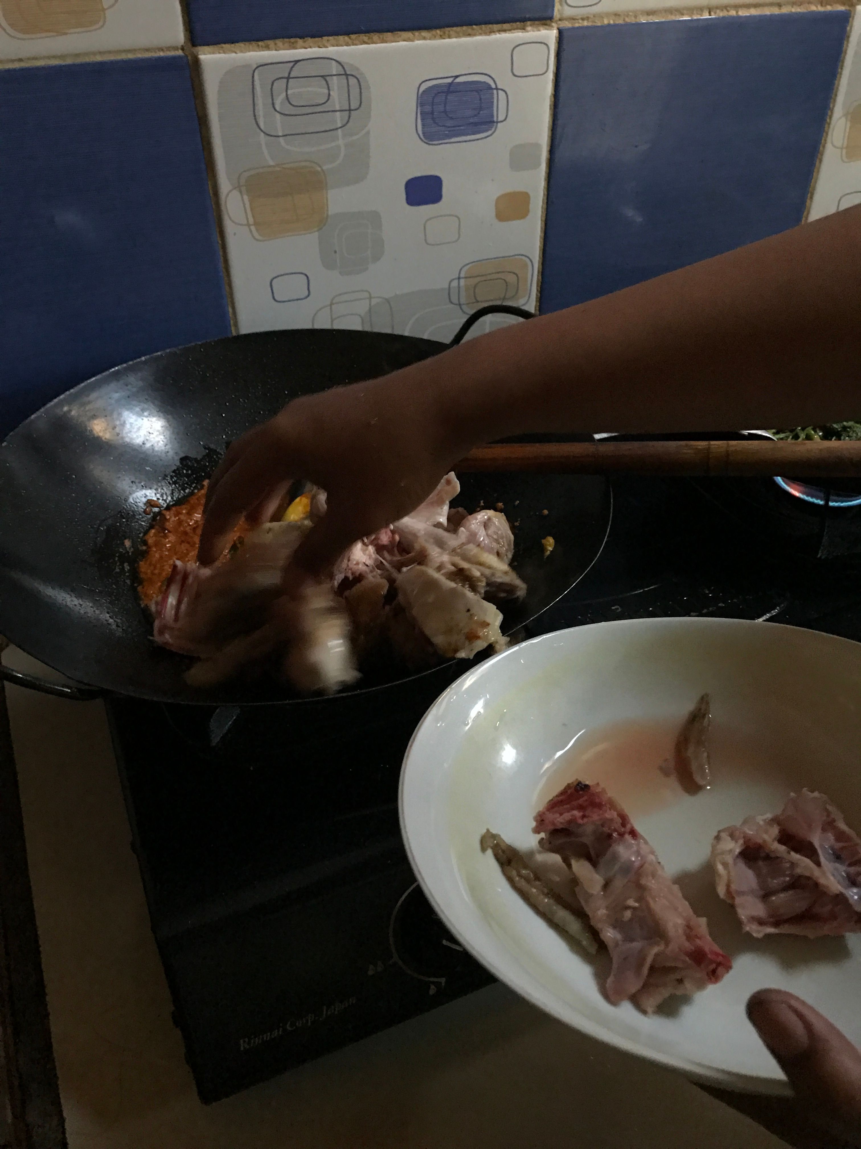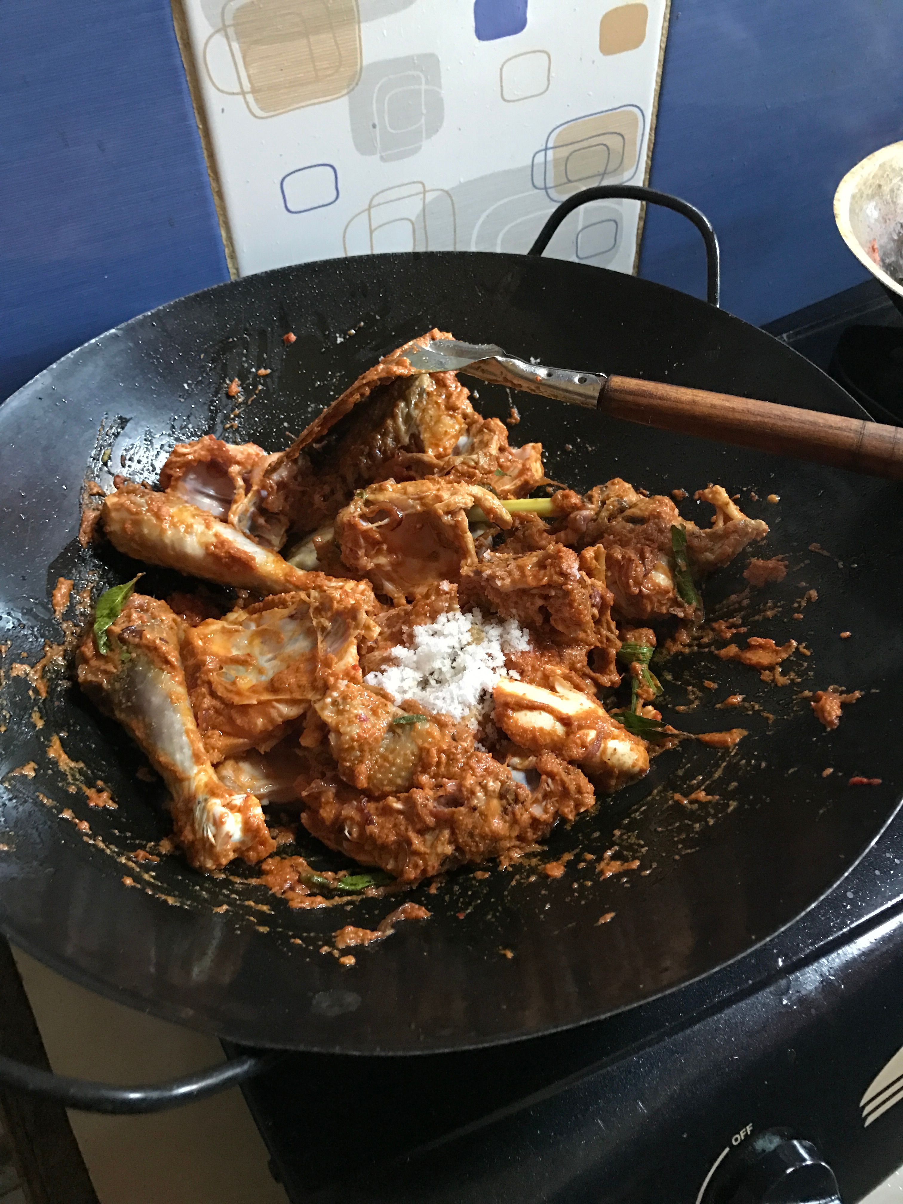 - Add enough salt into the chicken and input a little water and wait until the chicken becomes soft.