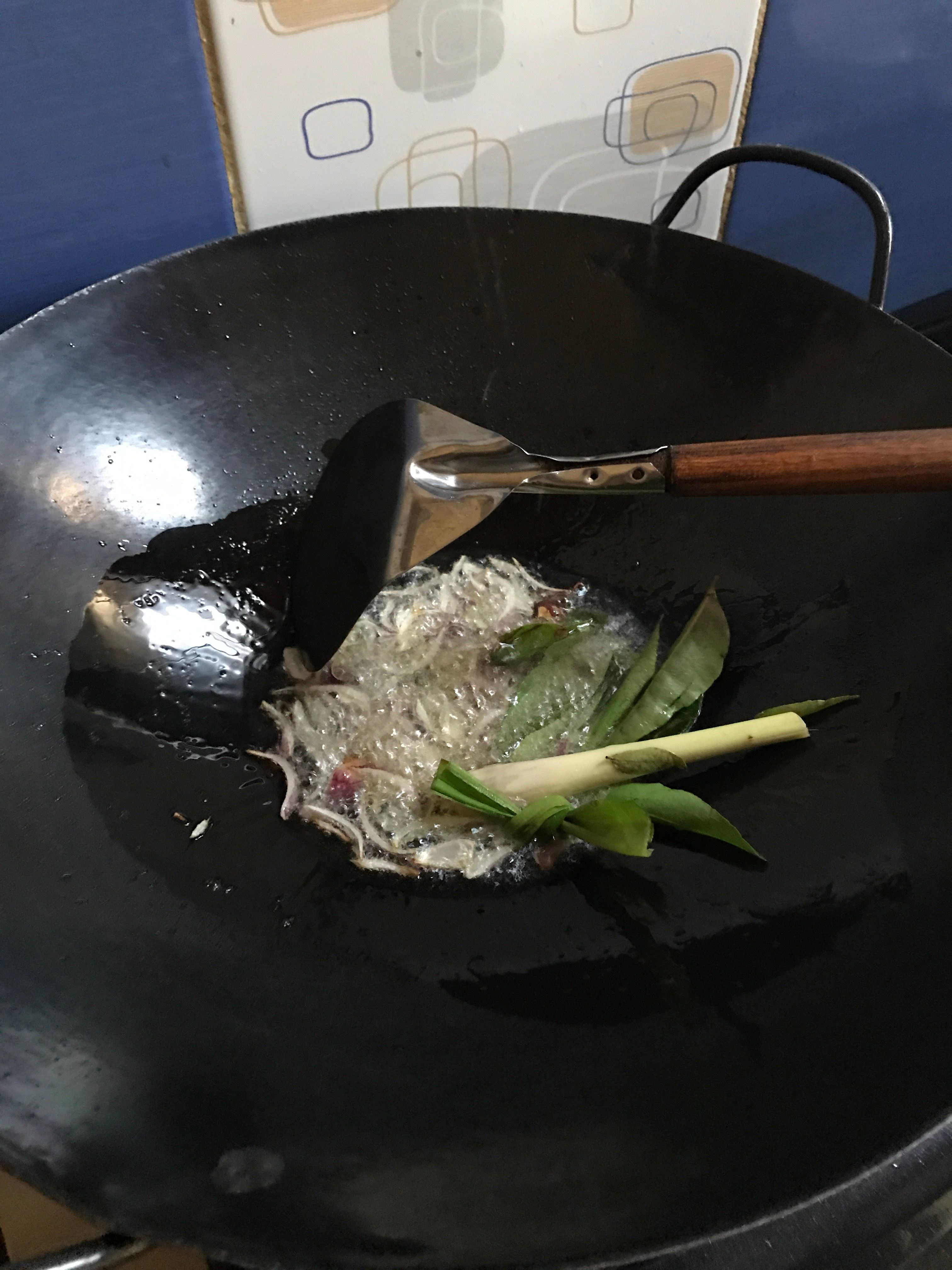 - Heat oil, then enter the leaves of lemongrass, lime leaves and sliced red onion until the smell is fragrant.