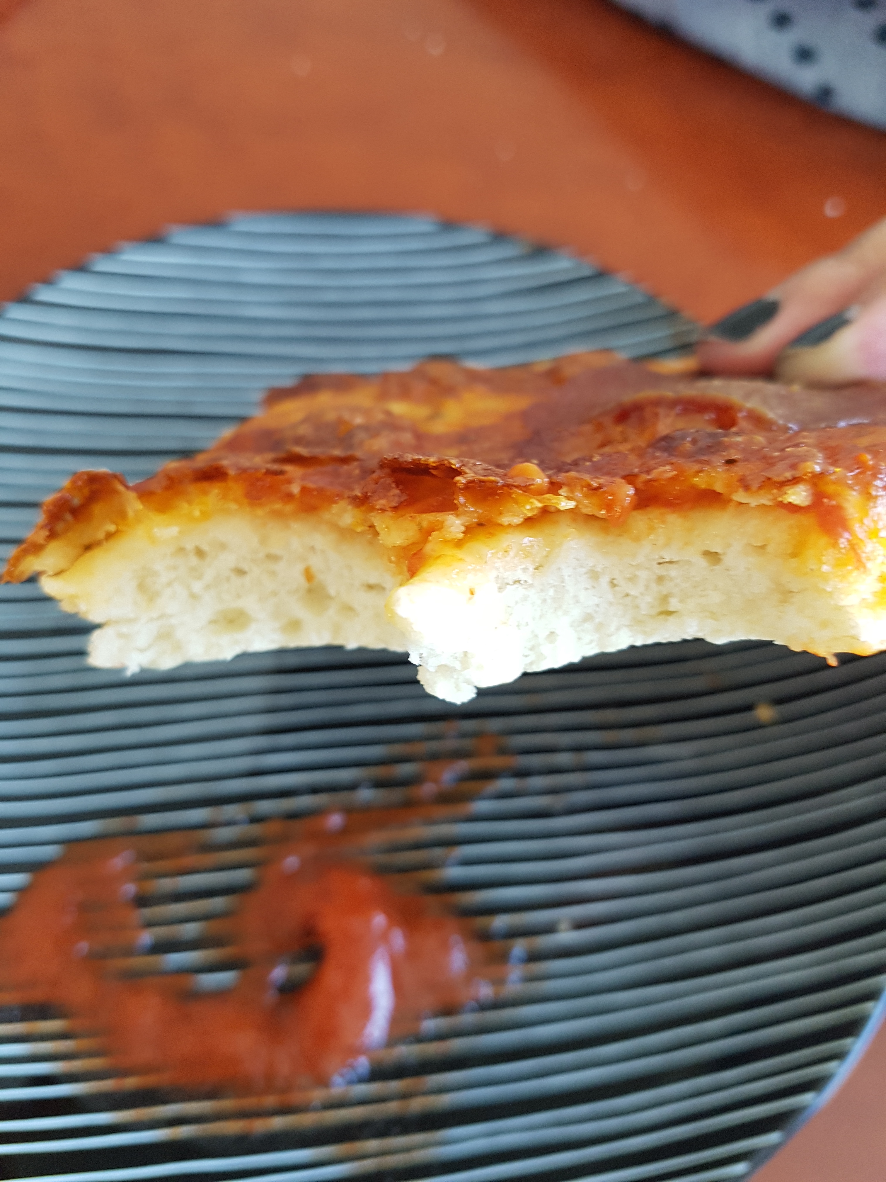 My husband loved the first pizza but he said that he likes to have more tomato sauce and the cheese more soft. So I put much more pasta tomato sauce and decreased the temperature with 10 degrees. So the oven was at 150 degrees Celsius for pizza #2. I baked the pizza also 40 minutes longer.
