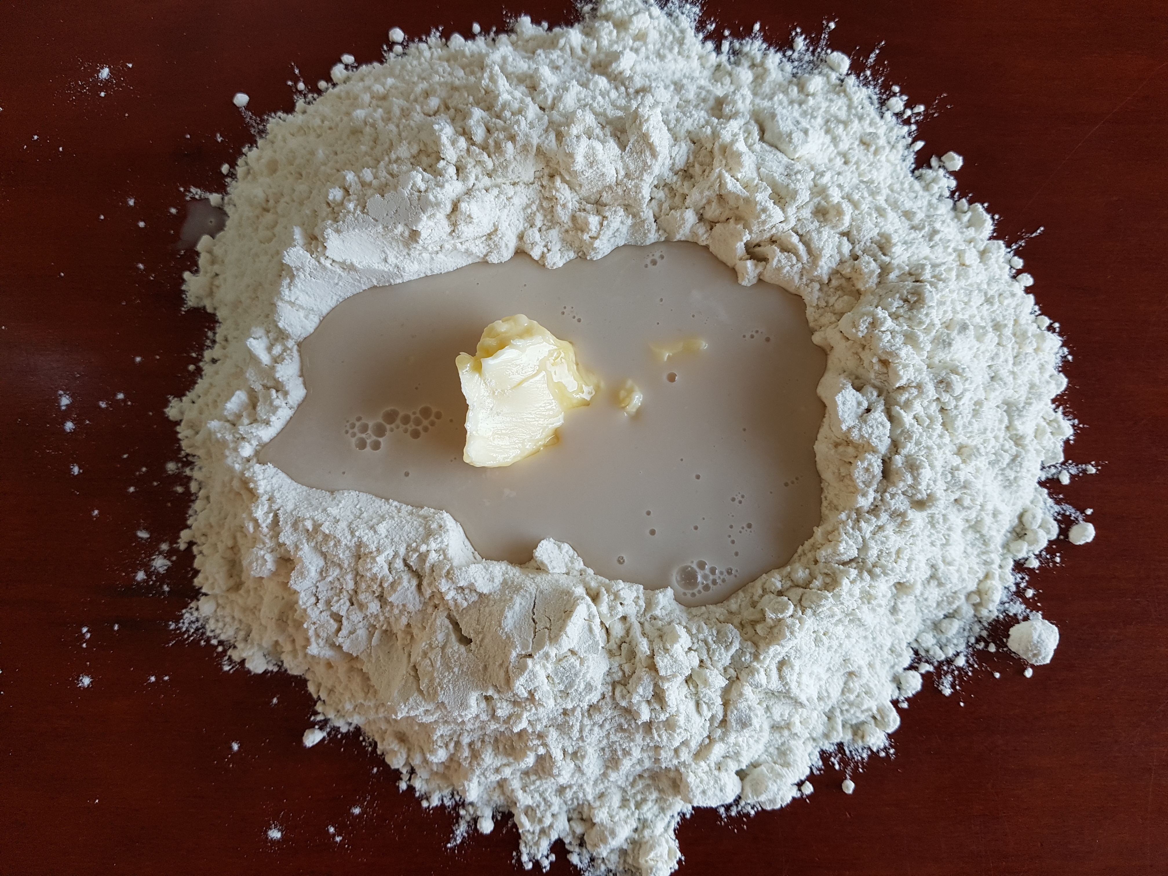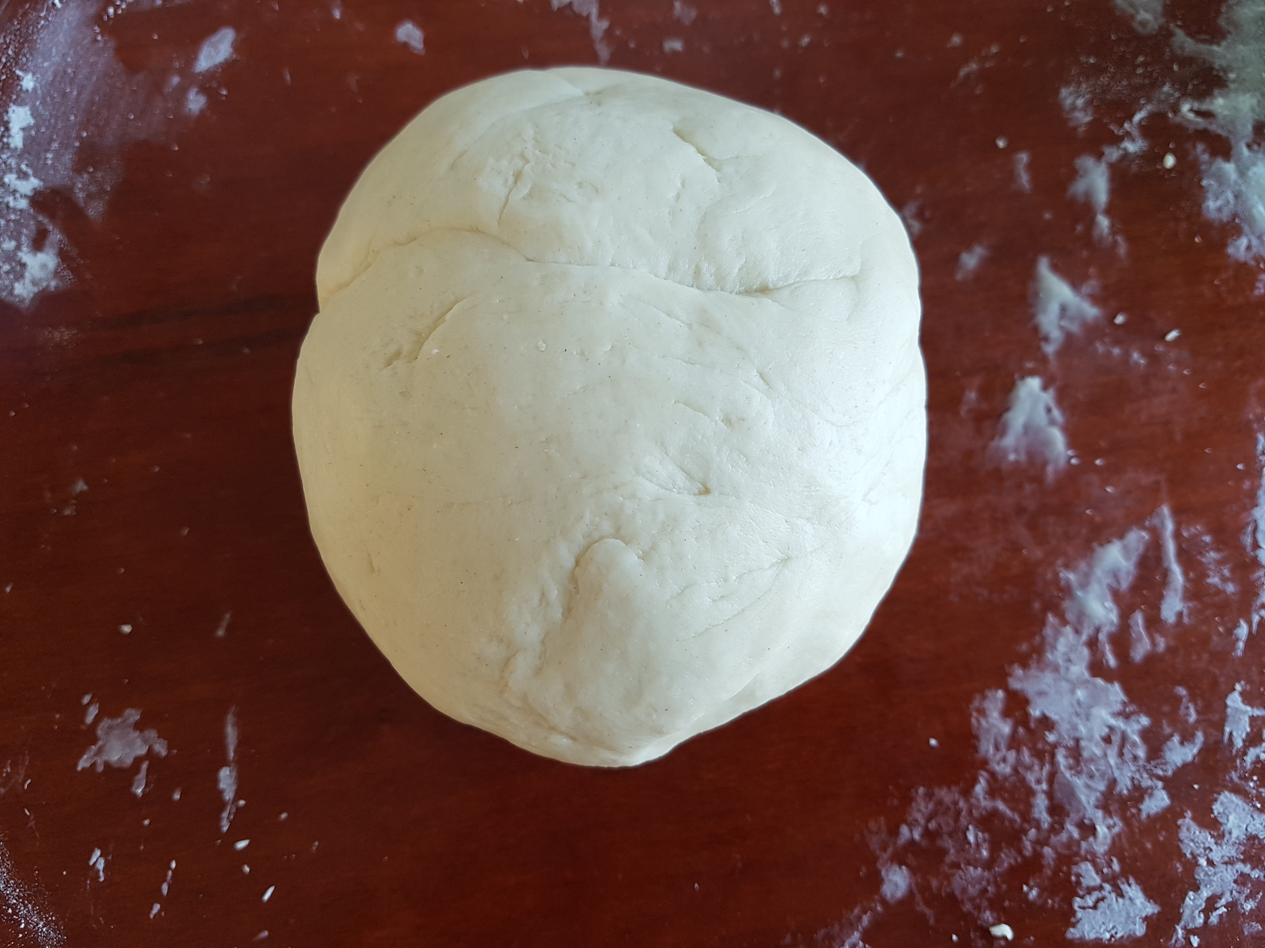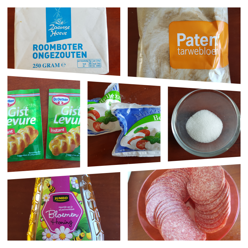 After the yeast is done, you can clean the dining table and make the pizza dough on the table (if you want). Mix the flour, butter, honey and yeast. Kneed for 10 minutes. Now add the salt to the dough and kneed again 10 minutes.