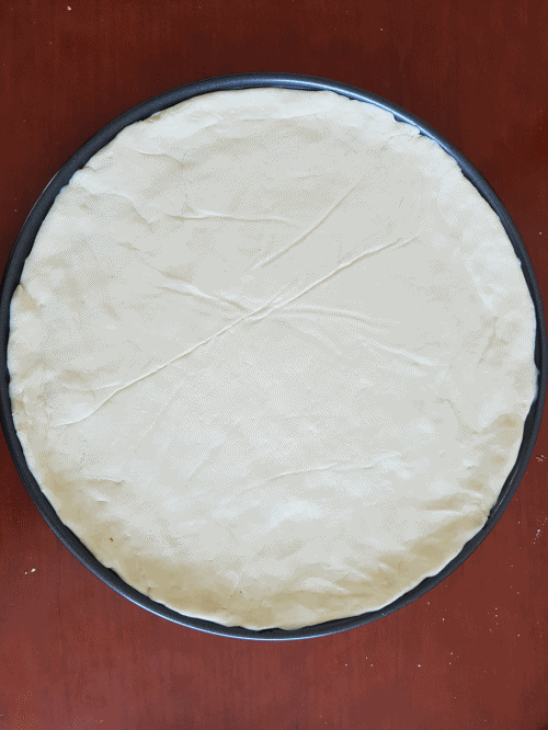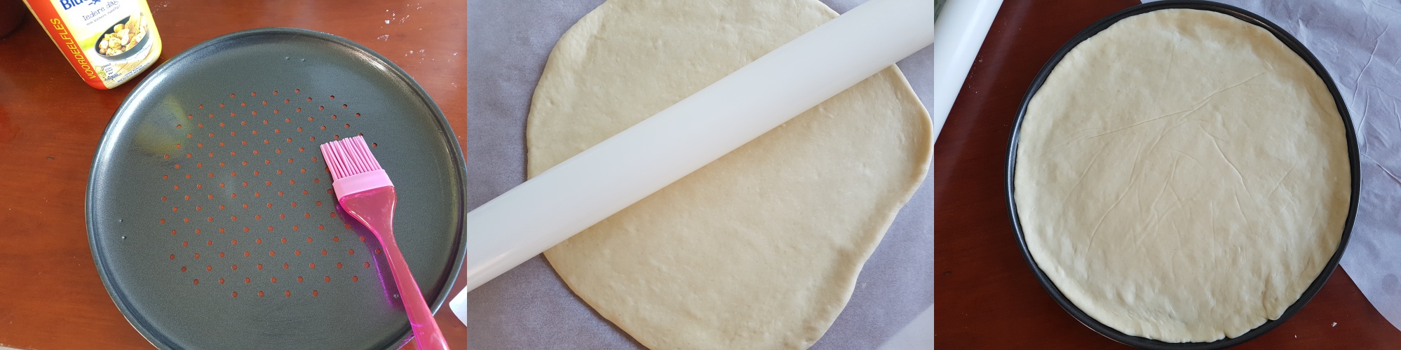 Pre-heat oven at 160 degrees Celsius and grease the pizza pan with a bit of (liquid) butter. Knead the dough once again and roll it out with a dough roller. Place the rolled out dough on the pizza pan and poke a few holes.