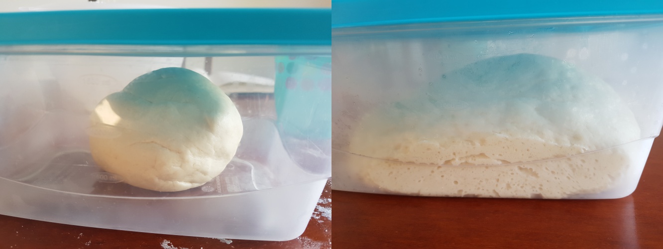 Place the pizza dough in an airtight container for about 45 minutes. Place it at a sunny place near the window. It should rise double the size.