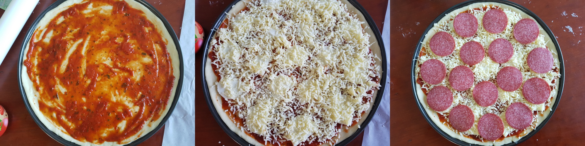 Spread the pasta tomato basilicum sauce over the pizza dough. Cut the mozarella in slices and place the mozarella slices on top. Then spread the grated cheese and at last the salami slices. Place the pizza in the oven for 40 minutes.
