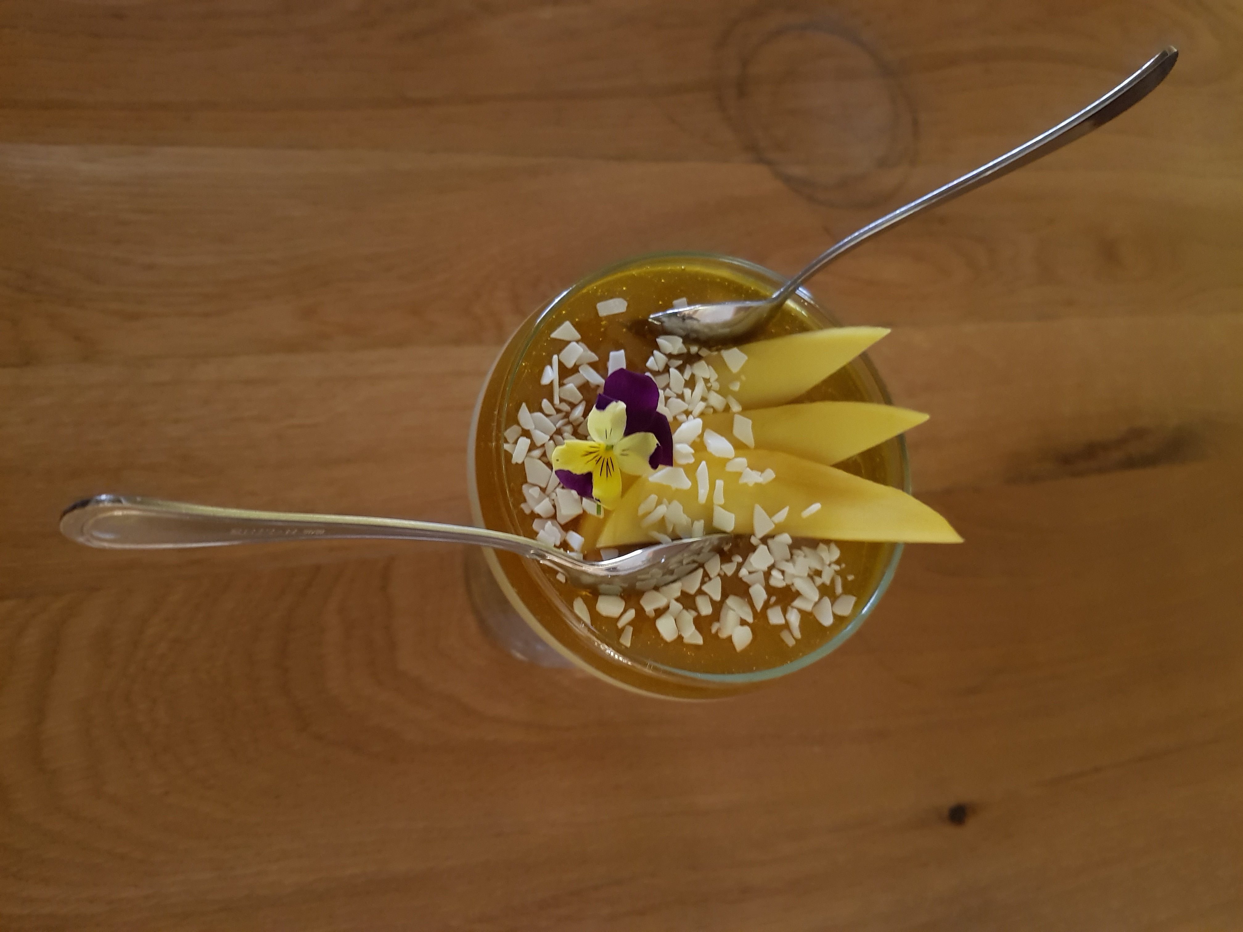 For the topping, you can put whatever is in your imagination, a strawberry, or a slice of banana, or like in my picture, some peach jam, some slices of mango, some white chocolate flakes and a little flower for decoration. This only you can decide how delicious the topping will be :)