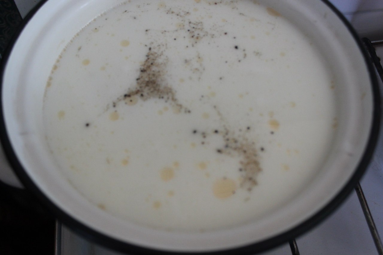 4. When potatoes and fish are ready, pour in the cream. Stir the soup, and season to taste with ground black pepper and leave the saucepan on a hot stove for a few minutes.