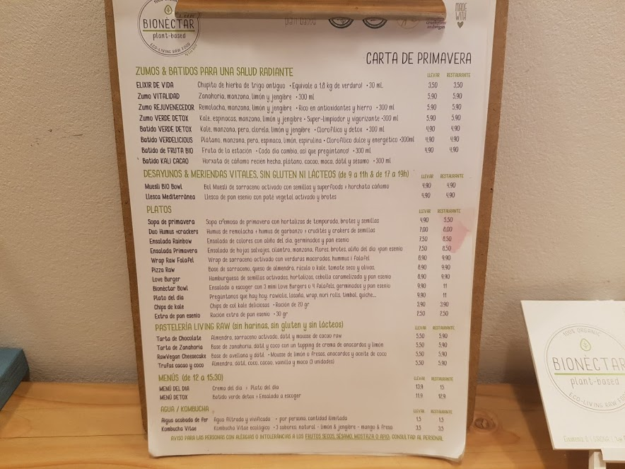 When I entered the restaurant, I was greeted with a smile by a young woman who was none other than Eva Roca, the founder of "Bionectar". She is an eco-chef and health coach and also runs the CRUDIVEGÀNIA cooking and natural food and vegetable school. In 2014, she created the first vocational training in Spain to become an expert in nutrition and eco-chef. In 2016, she received the Biocultura Eco-Gastronomy Award. Congratulations to her for this beautiful professional career! =)