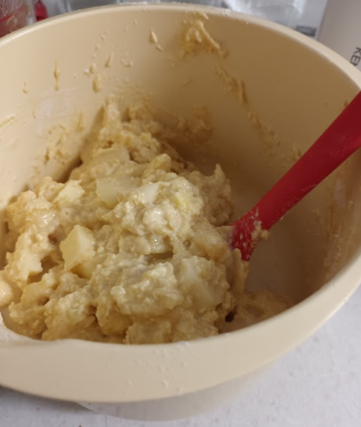 I added the raw apple cut into small pieces to the mixture, stirred slightly and then sifted the 150g of self-raising flour with a pinch of salt to add to the mixture. I 'folded' everything together making sure I didn't over stir - apparently this avoids the cake becoming hard, but that's never happened to me. I also added a bit of milk, but that wasn't really that needed as the mixture didn't seem to be dry.