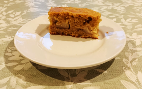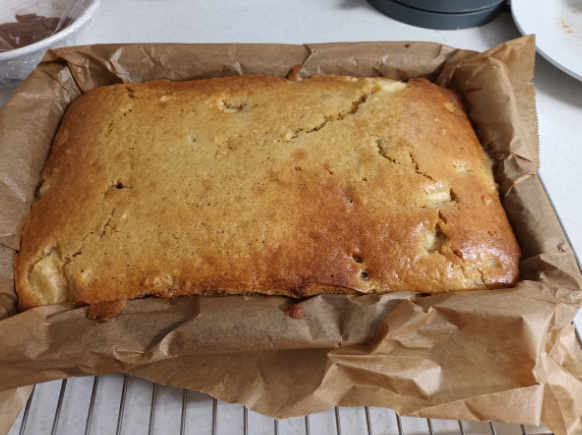 This time I tried a new to me recipe but as I didn’t have a loaf mold I used a tray cake tin which was slightly wider and shallower. As a result I didn’t have enough of the previously stewed apple to put on top.