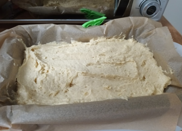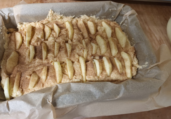 I creamed the butter and sugar with an electric whisk. I then added and whisked the eggs into that. I mixed in the sieved flour and baking powder. As it was a bit dry I added 2 tbs of milk. I then poured the mixture into a baking tray and then sliced three small (ish) apples and arranged them roughly into three rows.
