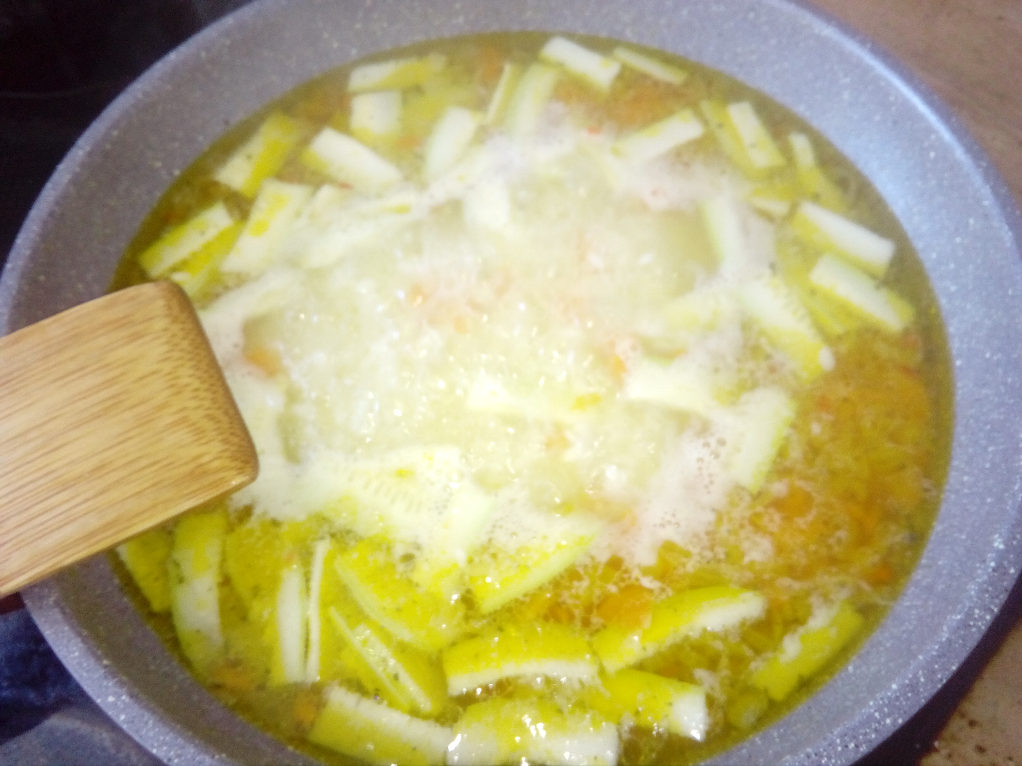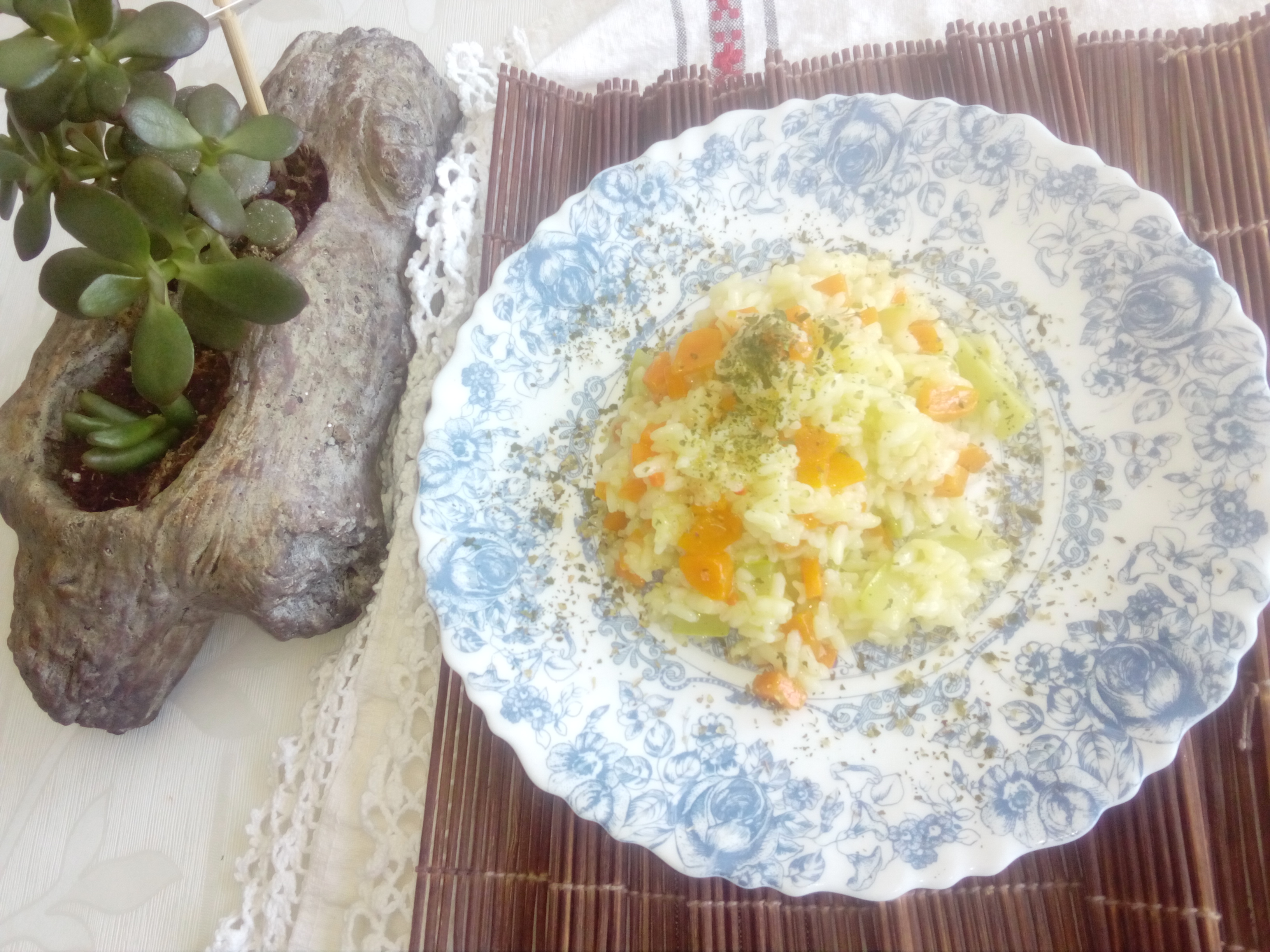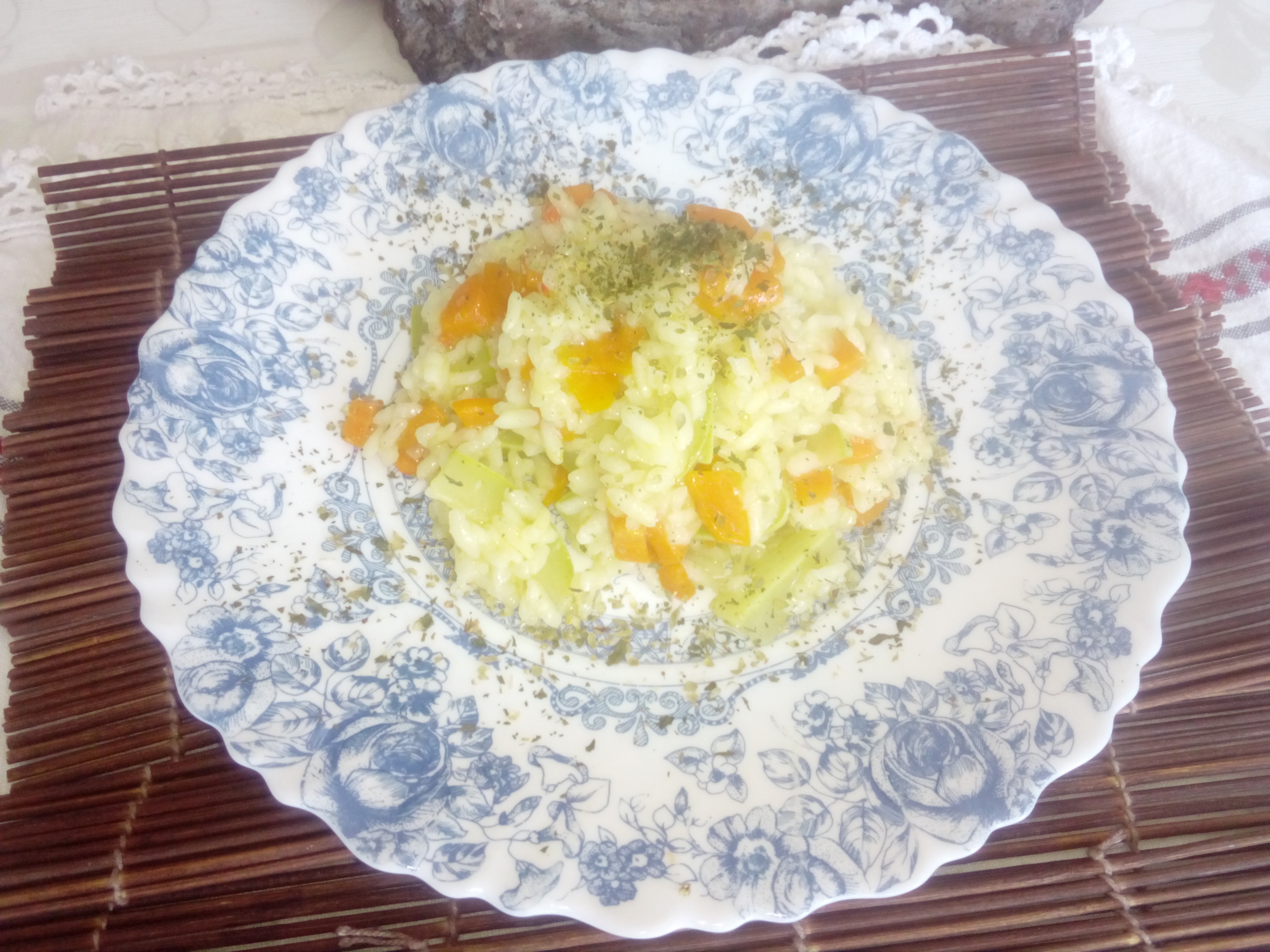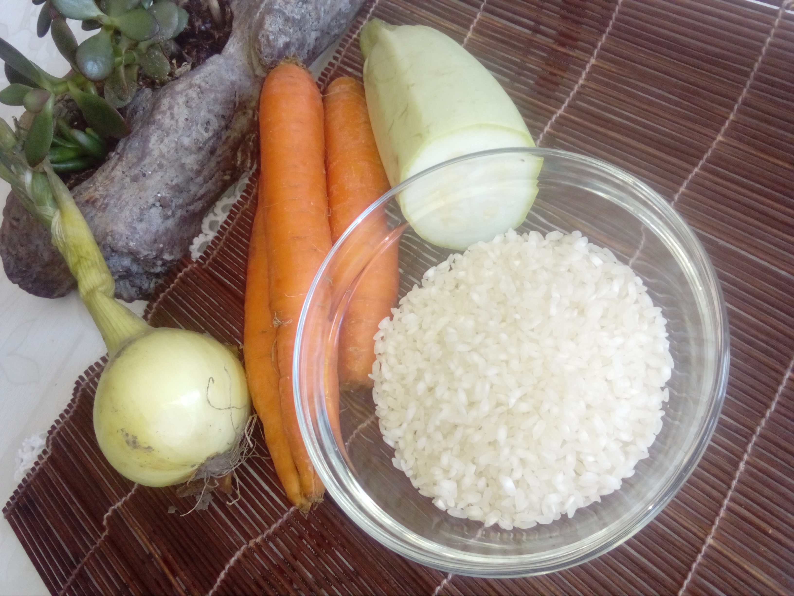 From the beginning, cut the onion and carrot, add a little olive oil and let it fry in medium heat for about 5 minutes, then add the rice and leave for 5 minutes to fry, then add some salt and water and leave for cooking, after 10 minutes add thinned slices of thin slices, and leave to cook for about 10 minutes, do not forget to mix constantly, then can serve hot, I finally added a few flavored herbs, parsley and Oregano for a taste I have a taste of it can be added a little parmegiano, if you want it well understood or with its taste you can add pepper if you want ....