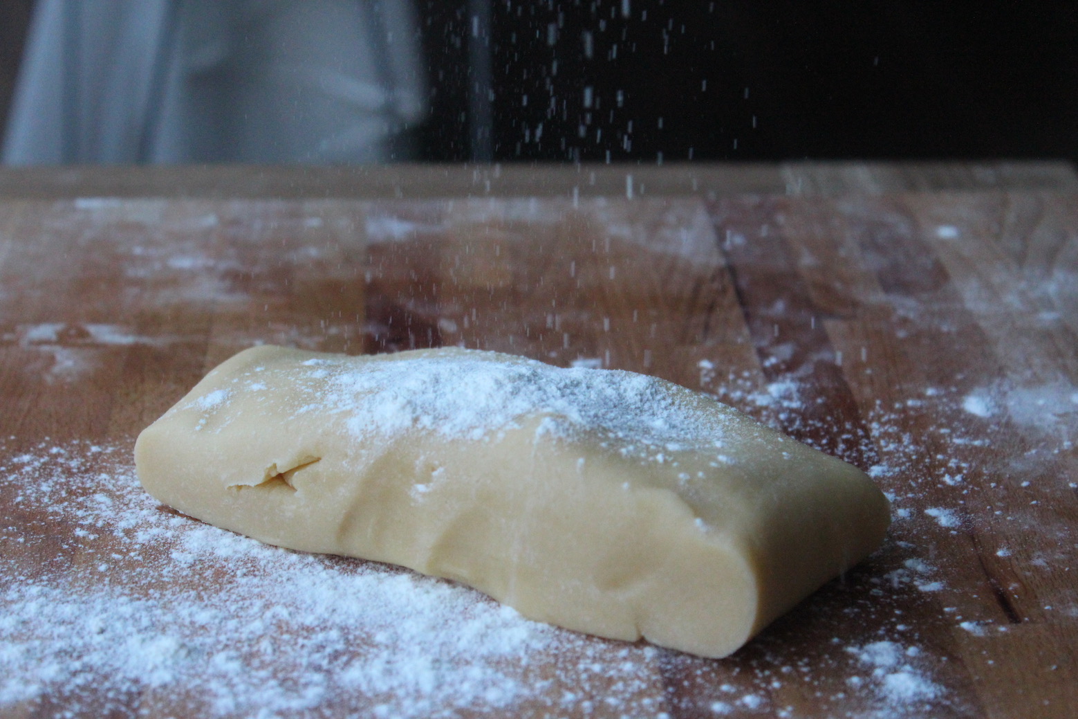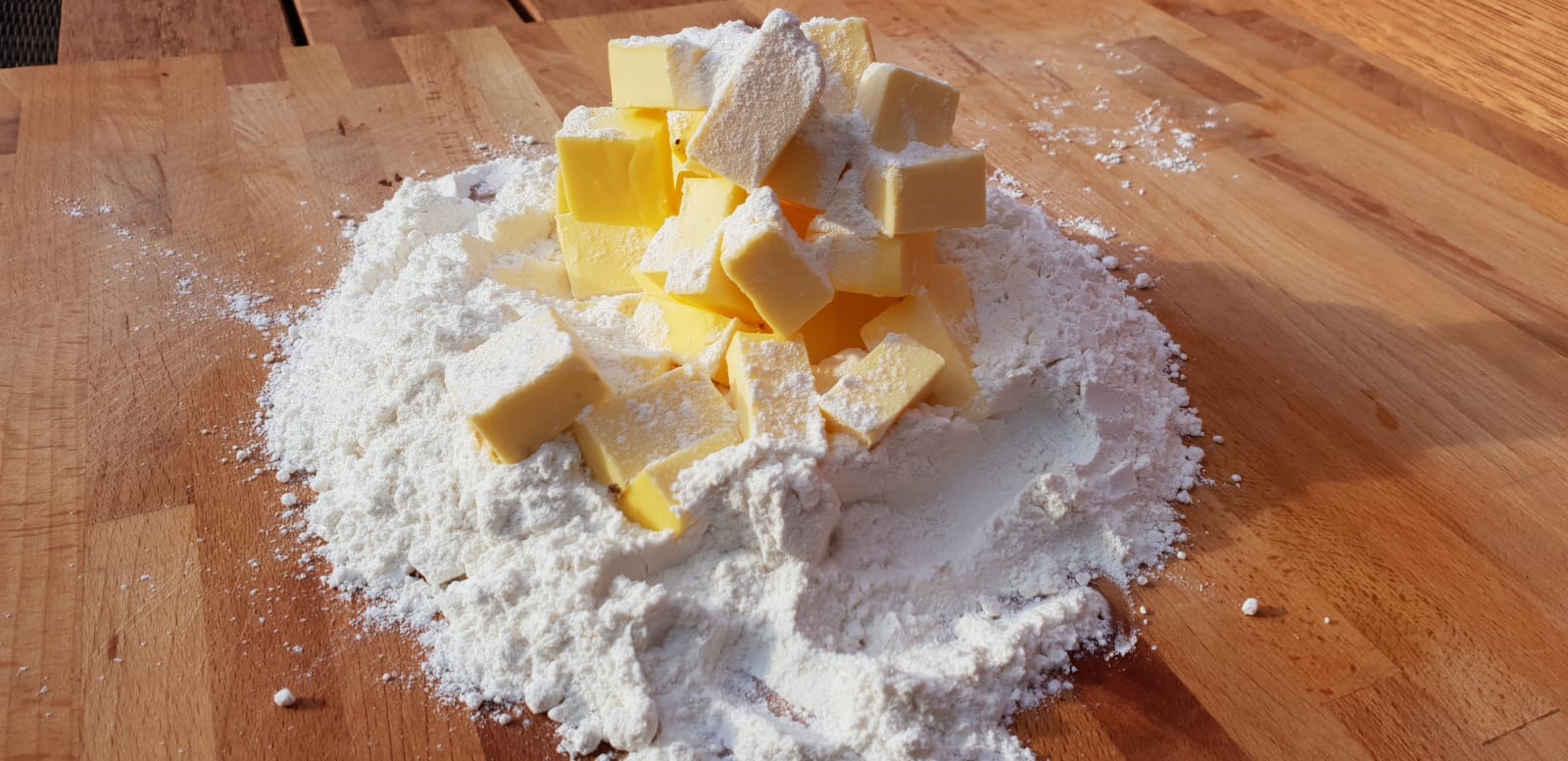 1. On a cooking board, mix the flour and butter into a dough. make a well in the centre and add the water and combine well to have a firm rough dough.