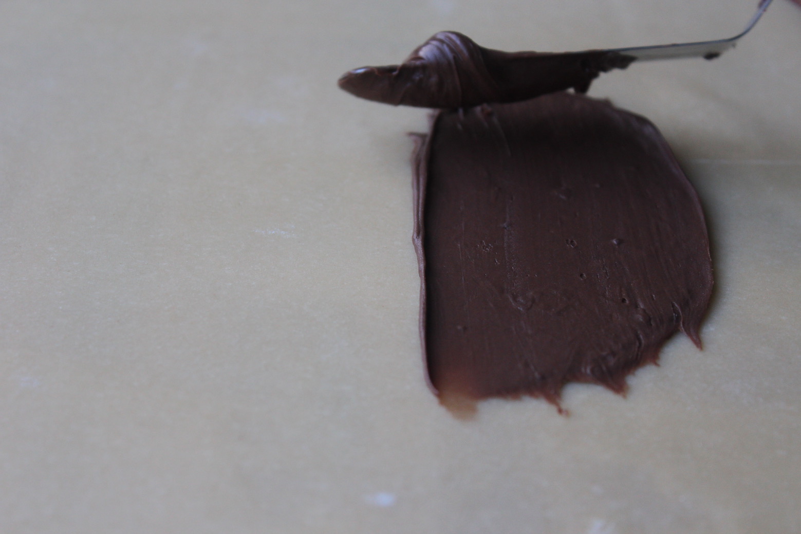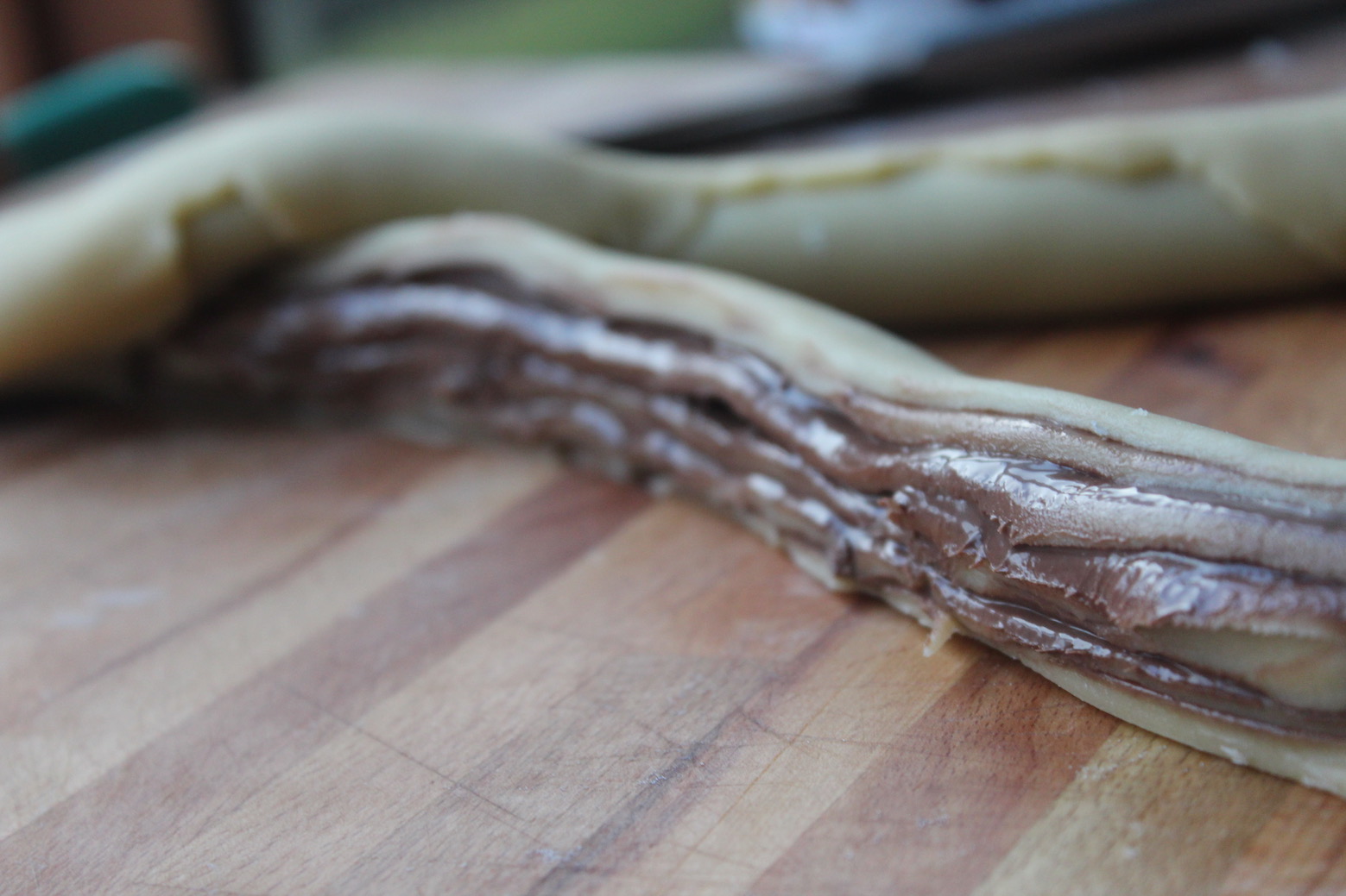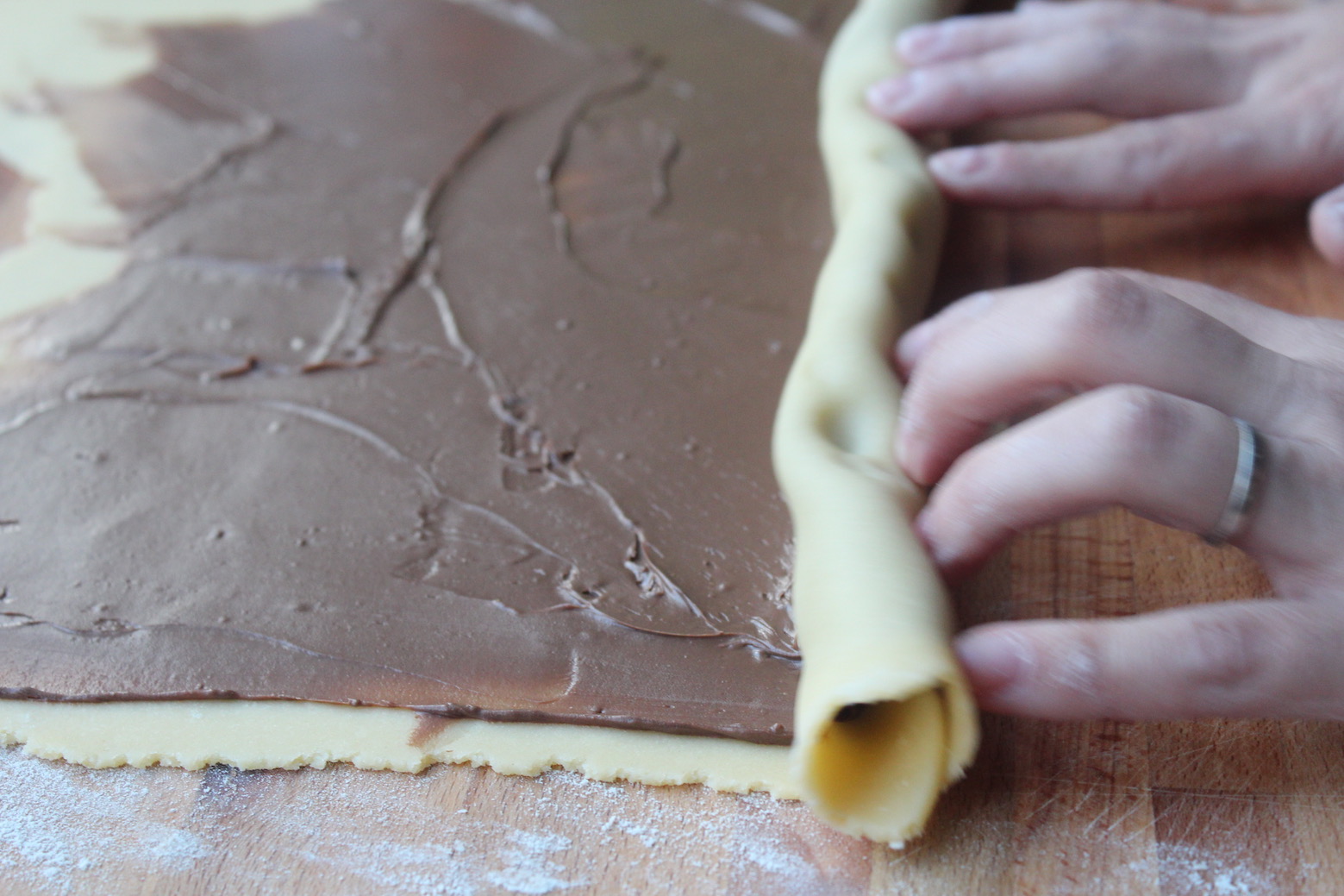 3. On a board, roll the dough flat and add the hazelnut spread.