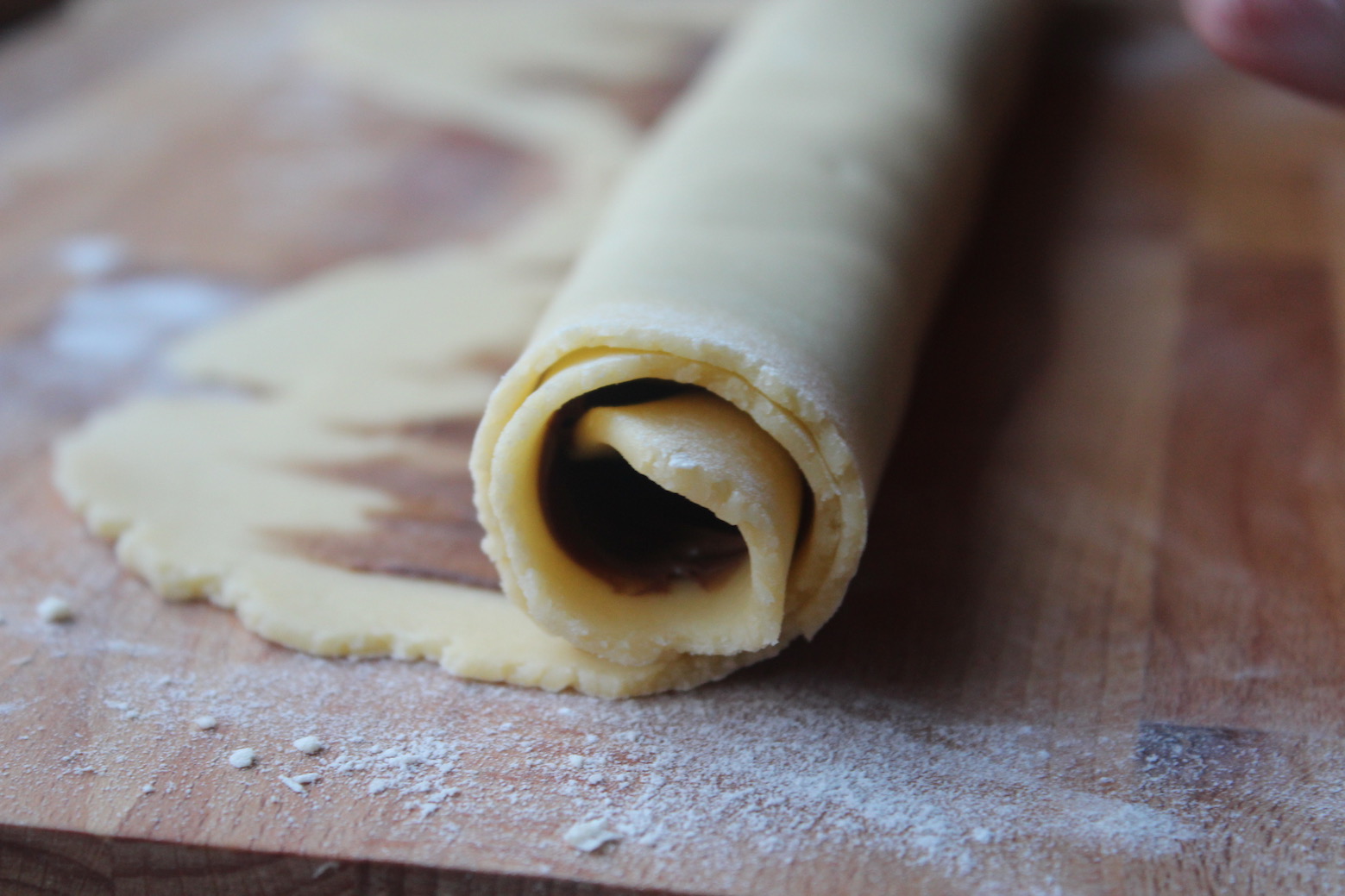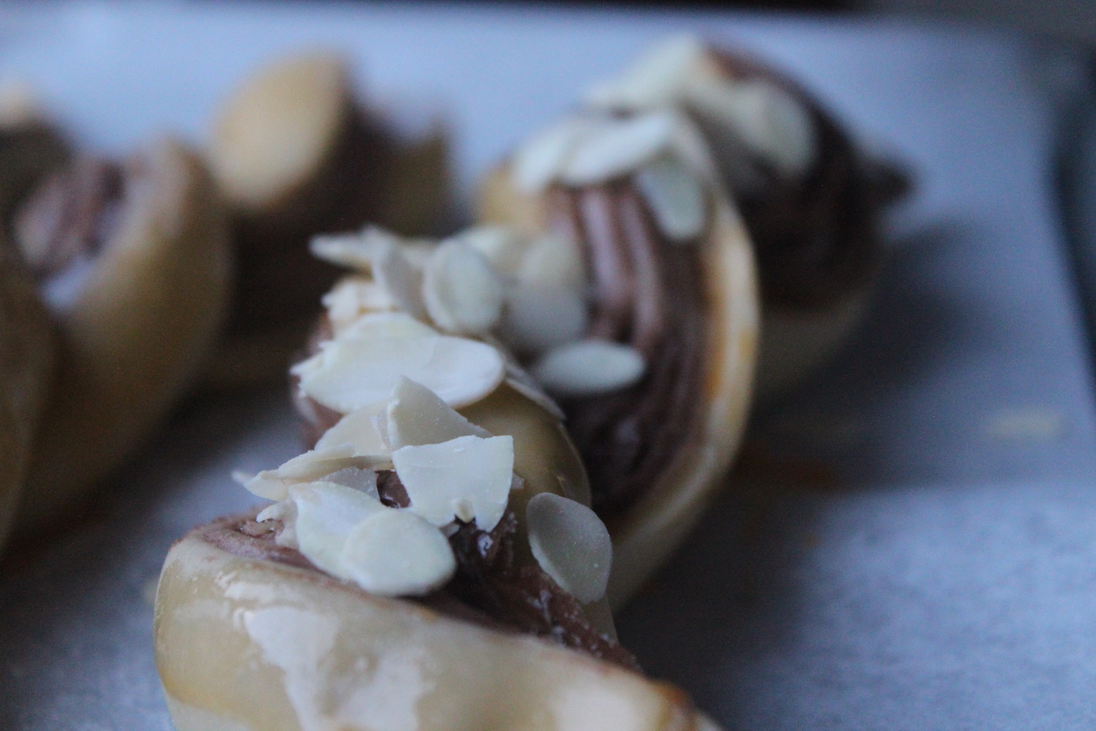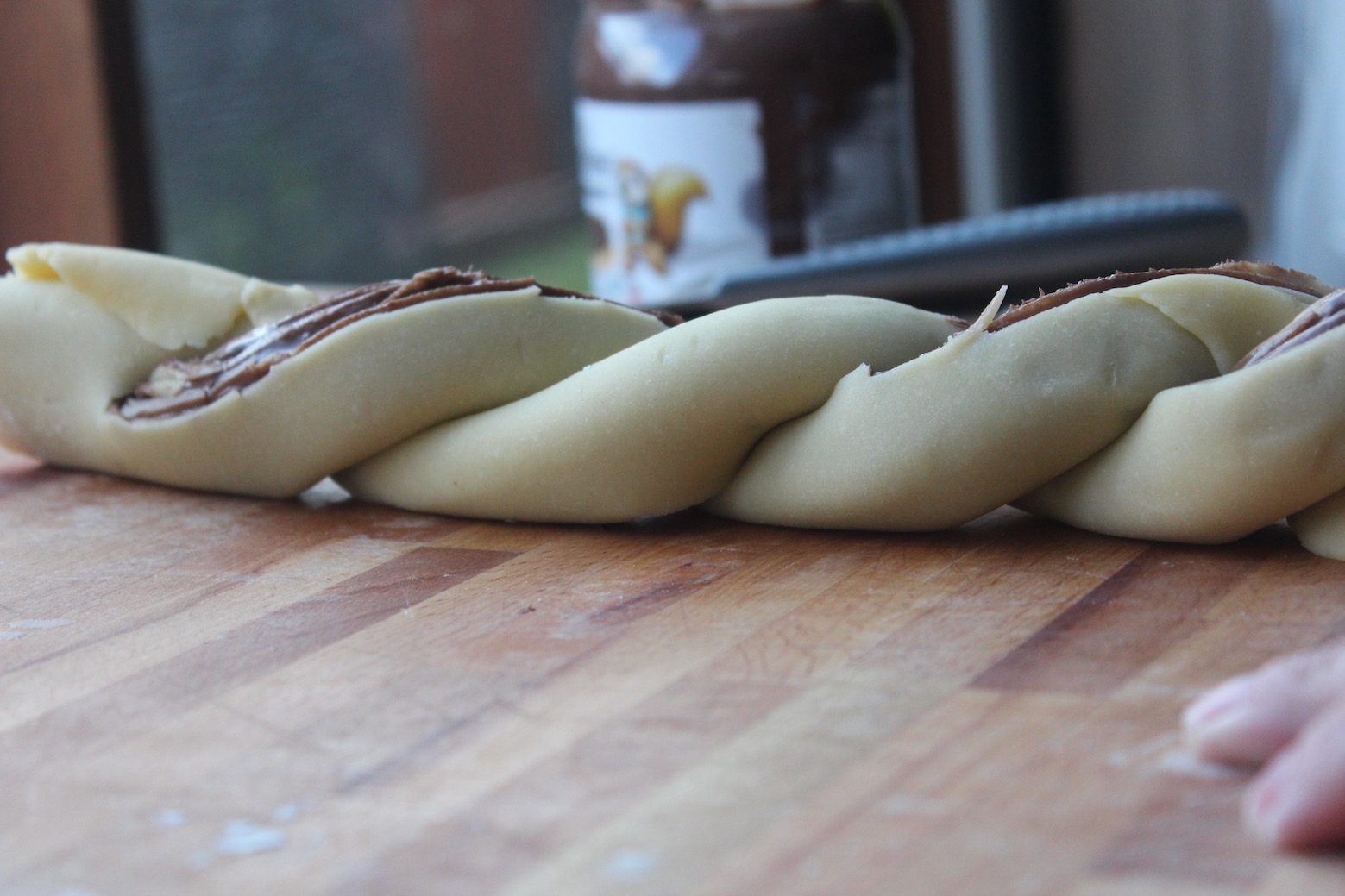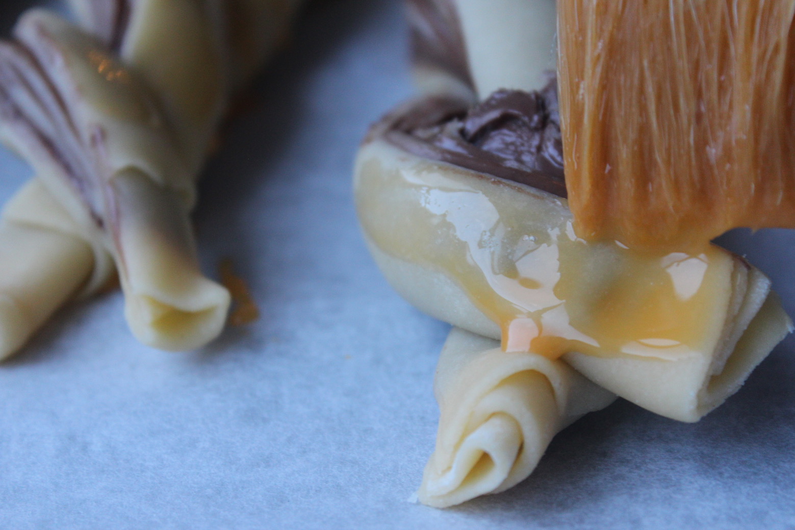 3. On a board, roll the dough flat and add the hazelnut spread.