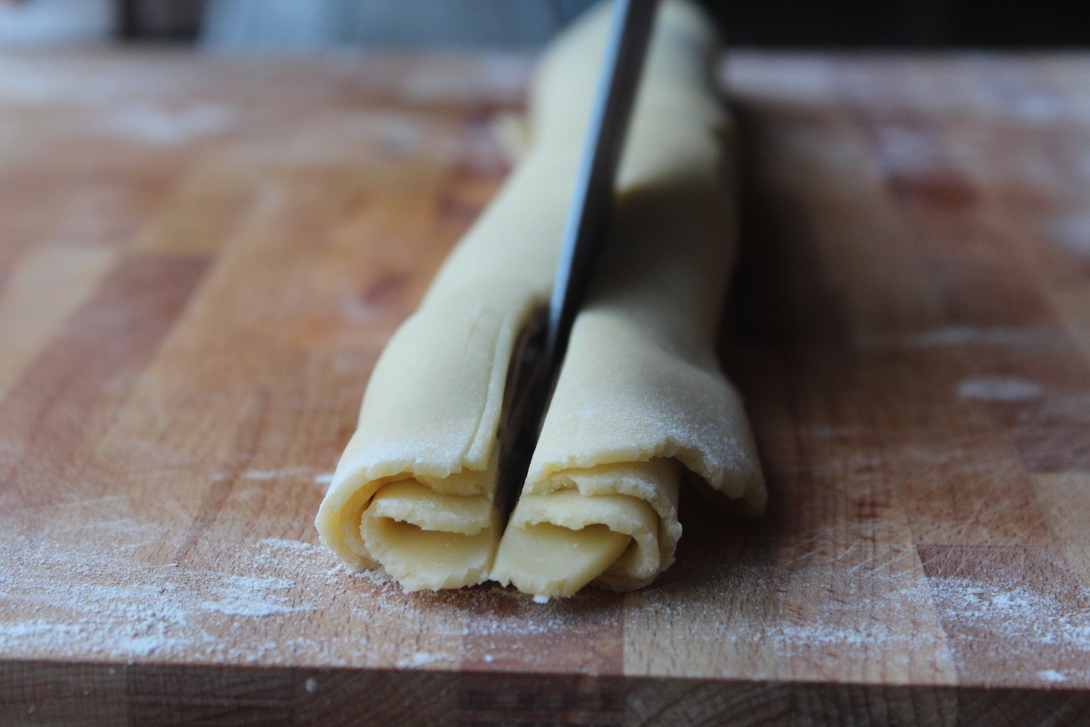 4. Then, starting from one end, roll the dough up tightly into a log.