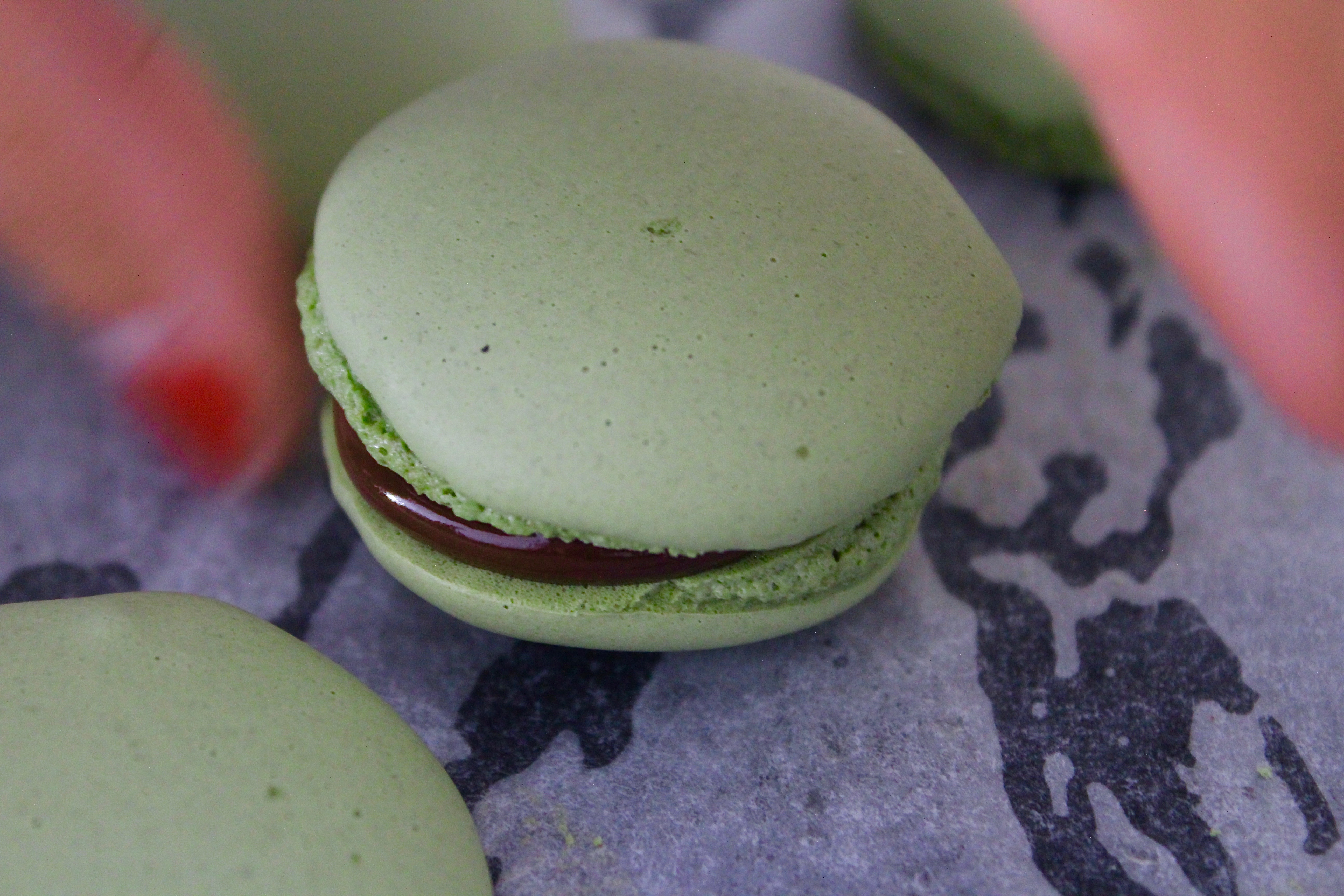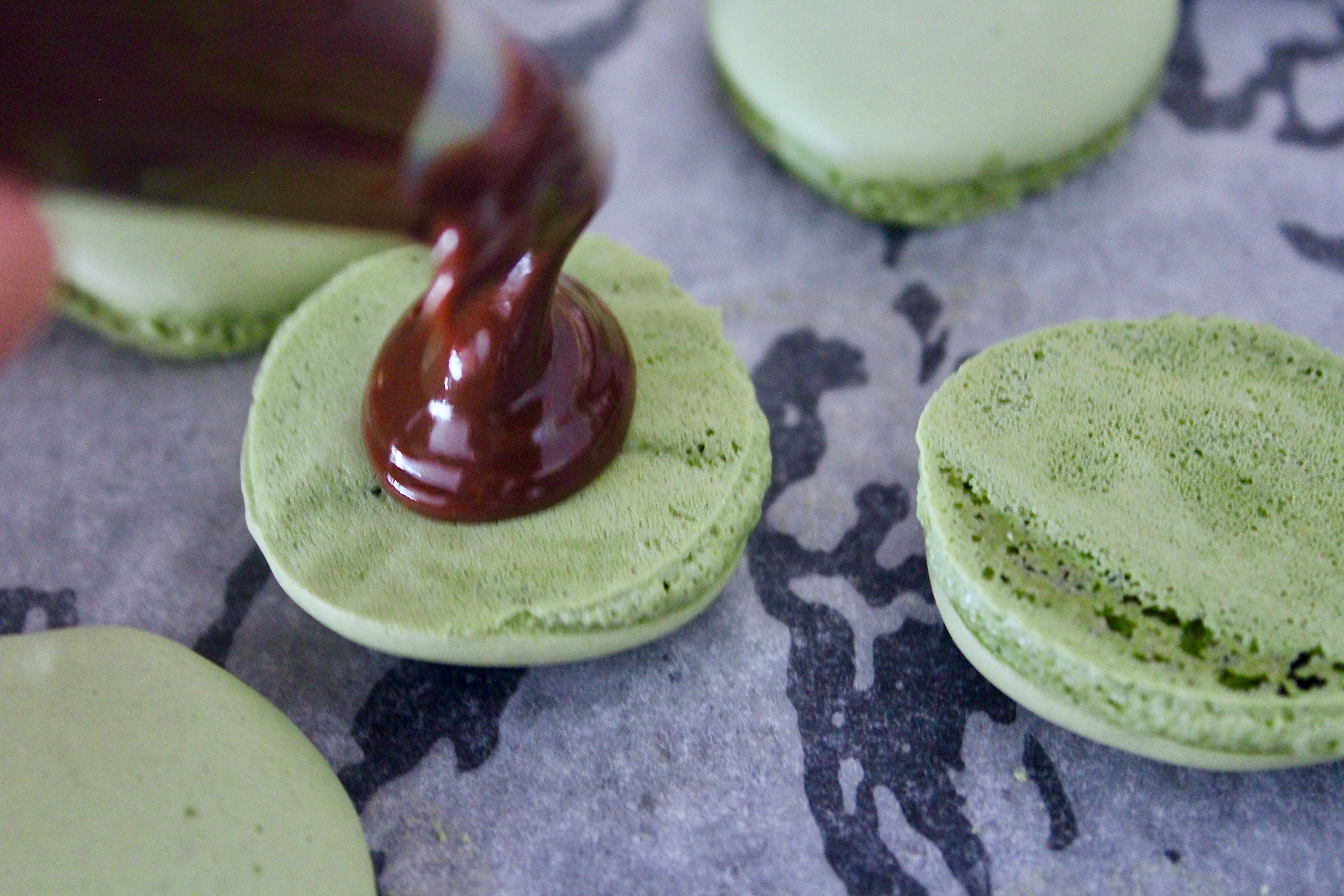 - Place the chocolate filling into a piping bag and spread on the inside of the macarons and sandwich them together. Refrigerate for at at least one day before serving, to meld the flavours. Serve macarons at room temperature.
