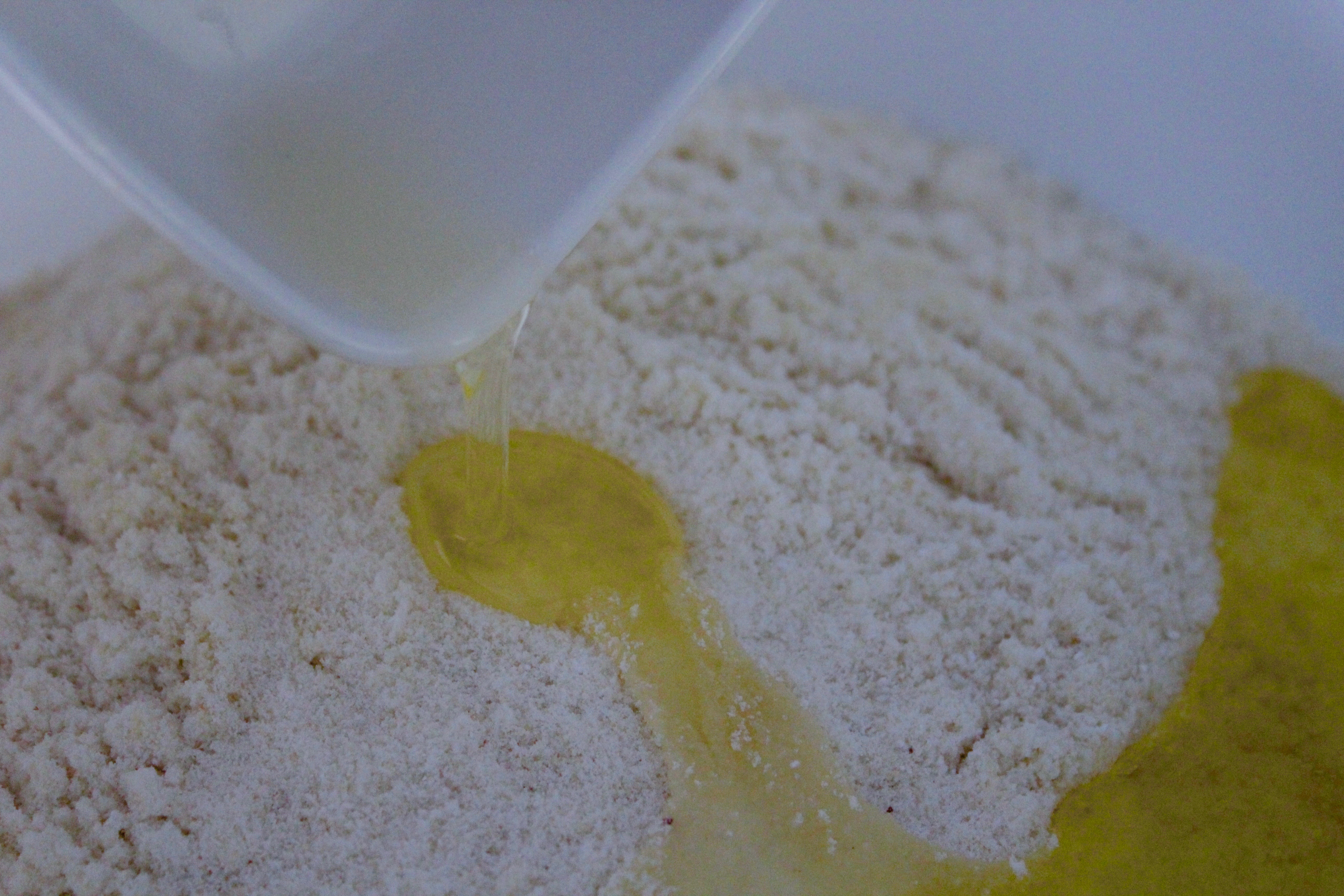 - Add the whipped whites over the almonds mixture and using a rubber or silicone spatula gently fold in until combined and smooth. Work the batter until it flows in very thick ribbons when the spatula is lifted.