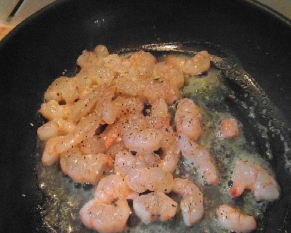 At the same time of the previous step the shrimp sauce is prepared, and for that we start by sautéing the garlic in the hot oil (without letting it burn because it would alter the final flavor), then add the shrimps seasoned with a little salt and pepper and they are stirring.