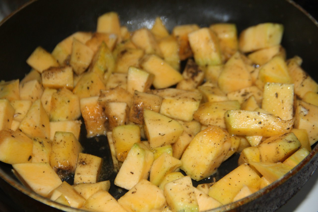 1. Pumpkin peeled, cut into medium dice, season with salt and pepper, sprinkle with seasoning "Provence herbs". Fry in melted butter for 10 minutes, stirring occasionally.