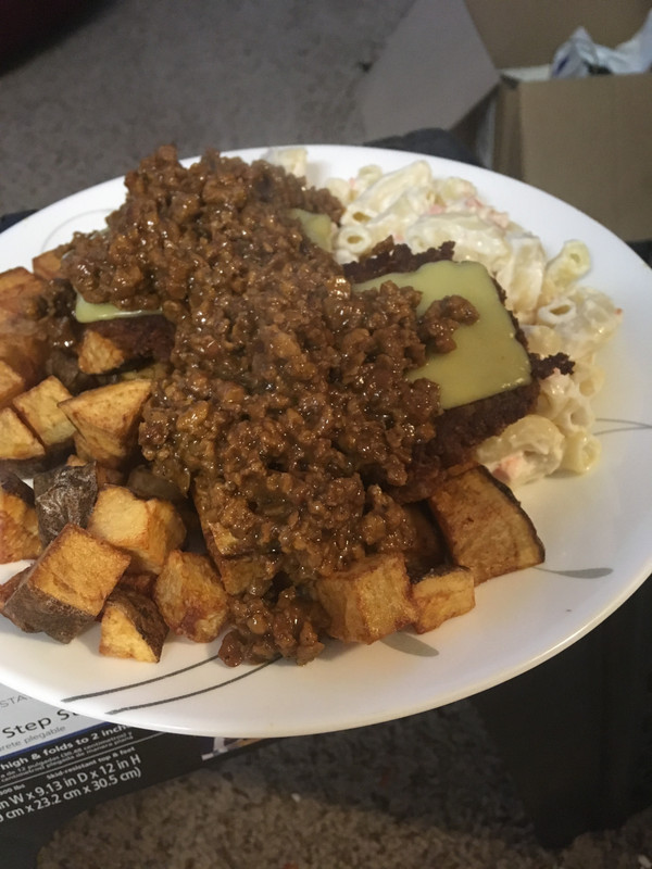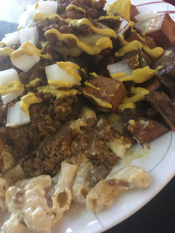 Beyond Burger for the burgers, a vegan mayo in the mac salad, and Gardein beefless crumbles in the hot sauce. Simple.