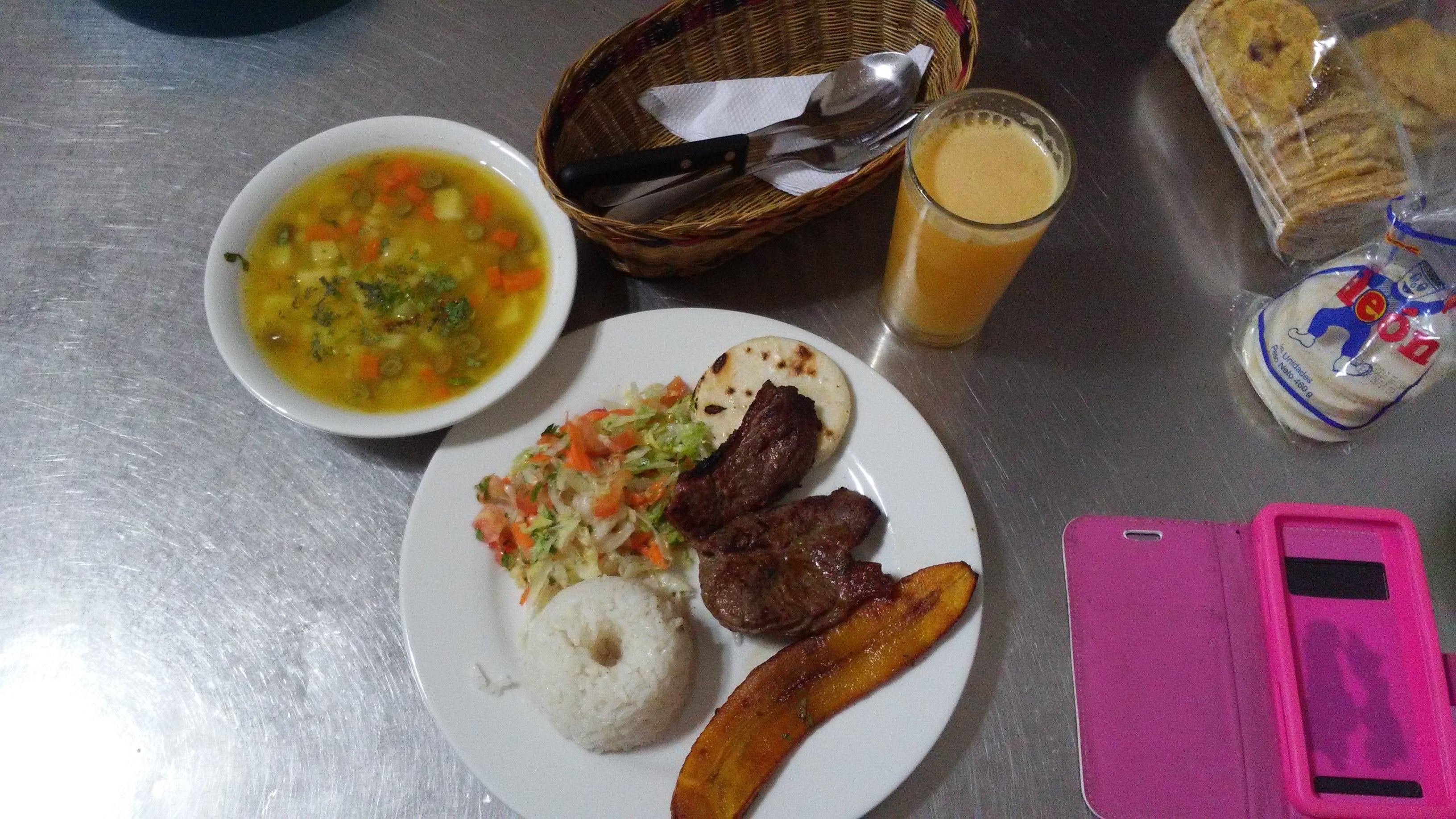 En el plato principal: es un bistek de solomo con arroz, ensalada y plátano. Es muy sencillo colocar es bistek a la plancha y dejar a su gusto aplicar sal. Arroz y tajada de plátano frito. Arepita y ensalada de tomate, lechuga, y cebolla.