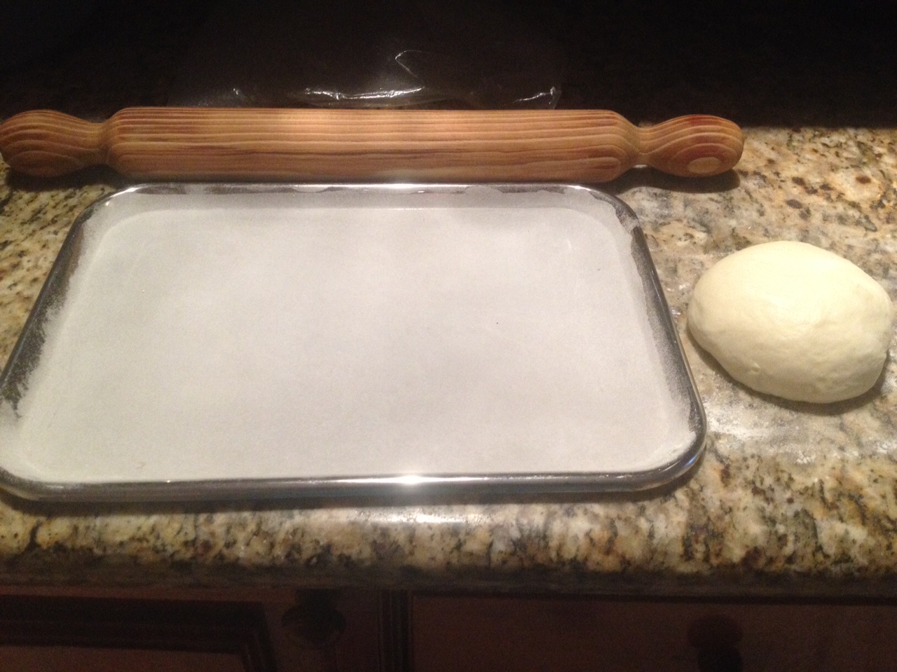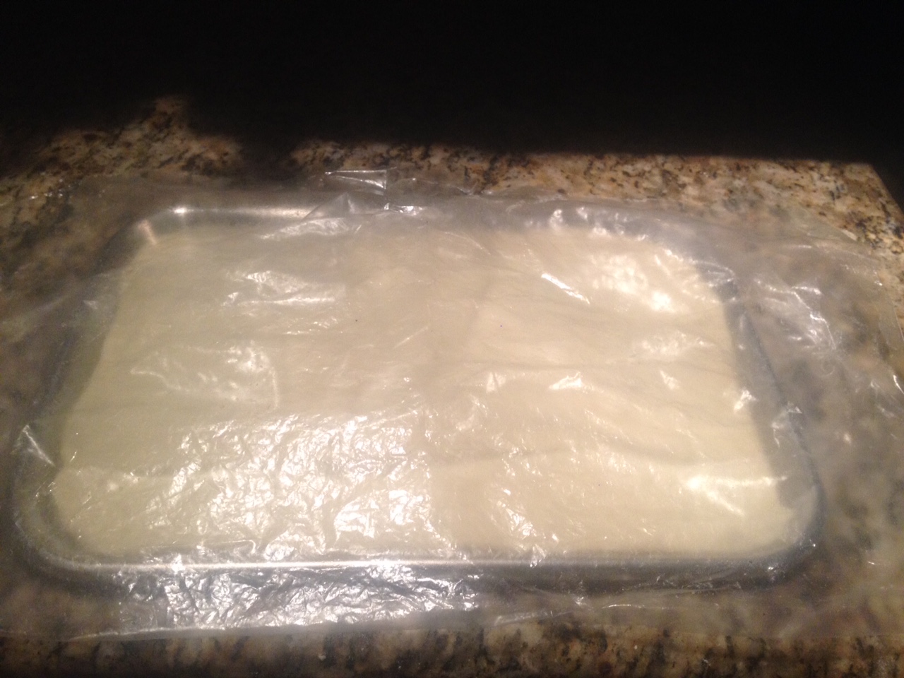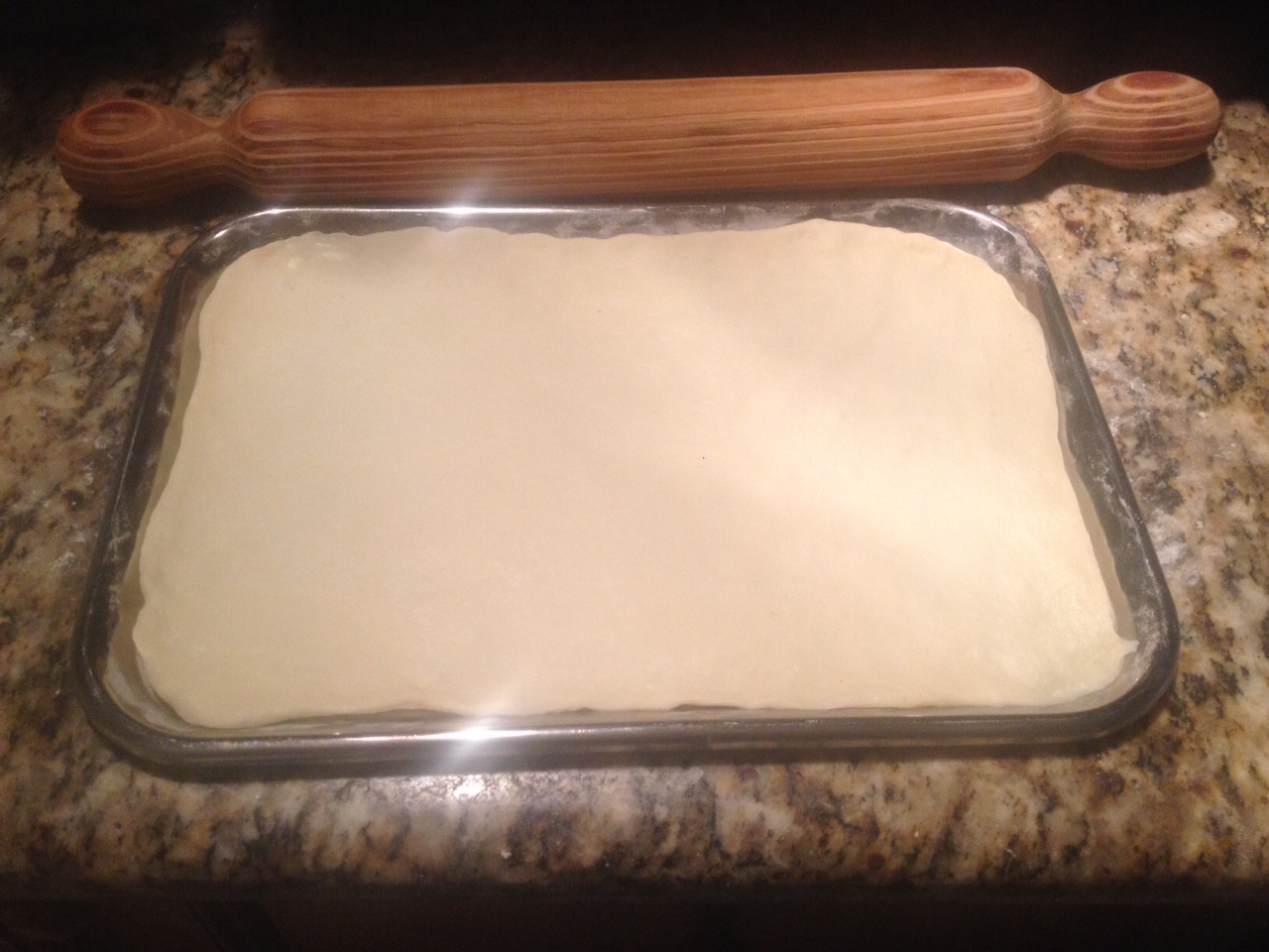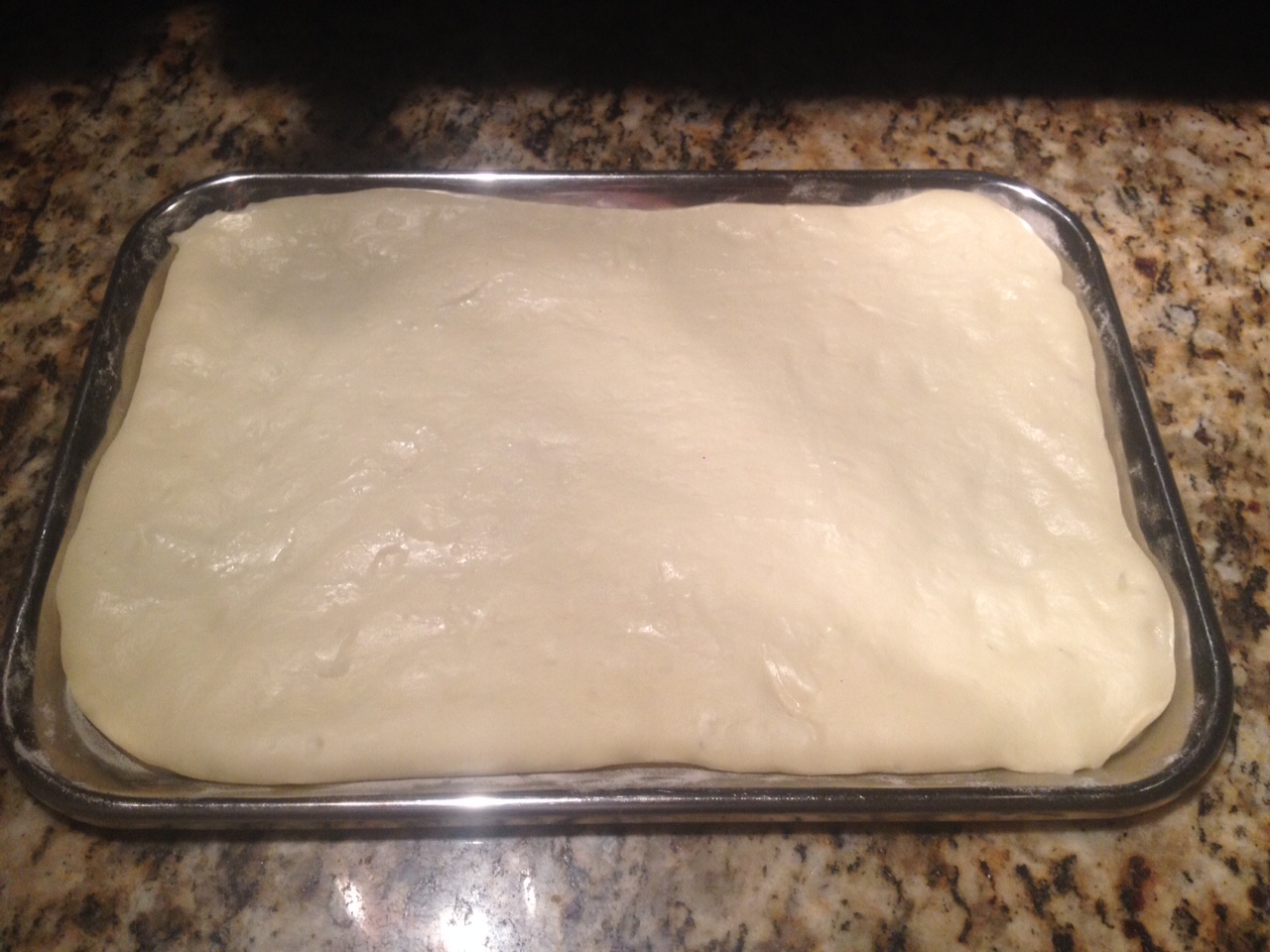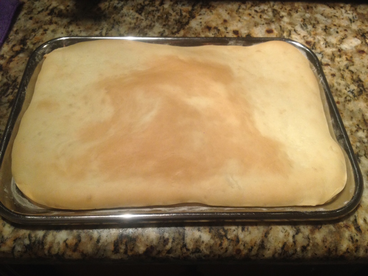 Extienda la masa de forma rectangular y coloquelan en una placa enharinada, tápenla con un plástico y deje leudar por 30 minutos.