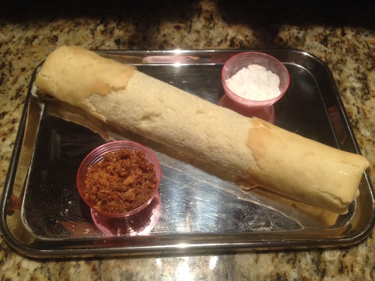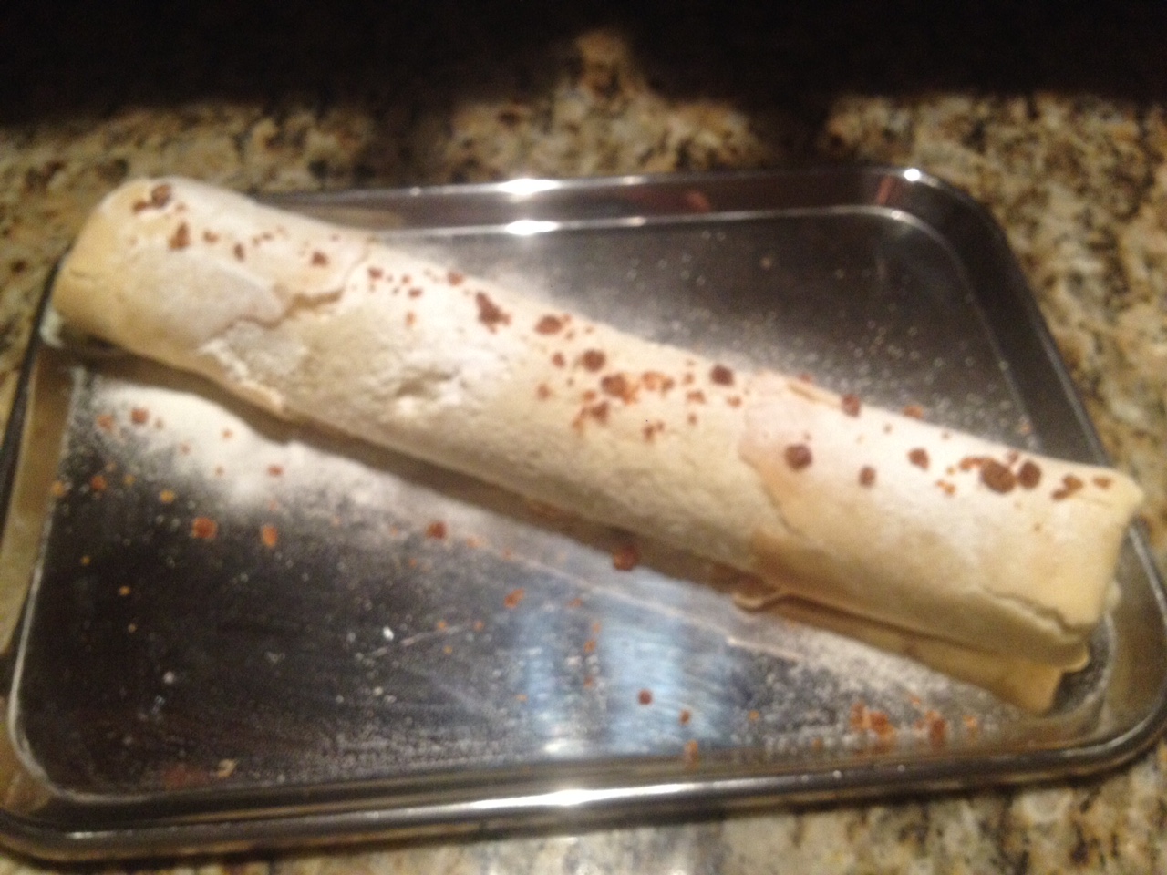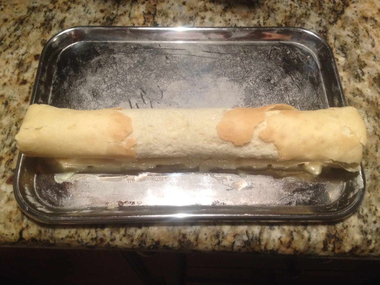 Enrolle el rectángulo con la ayuda de un paño y déjelo así por 20 minutos, luego añada la cantidad de crema pastelera deseada, vuelva a enrollar y lleve a la heladera por 1 hora.
