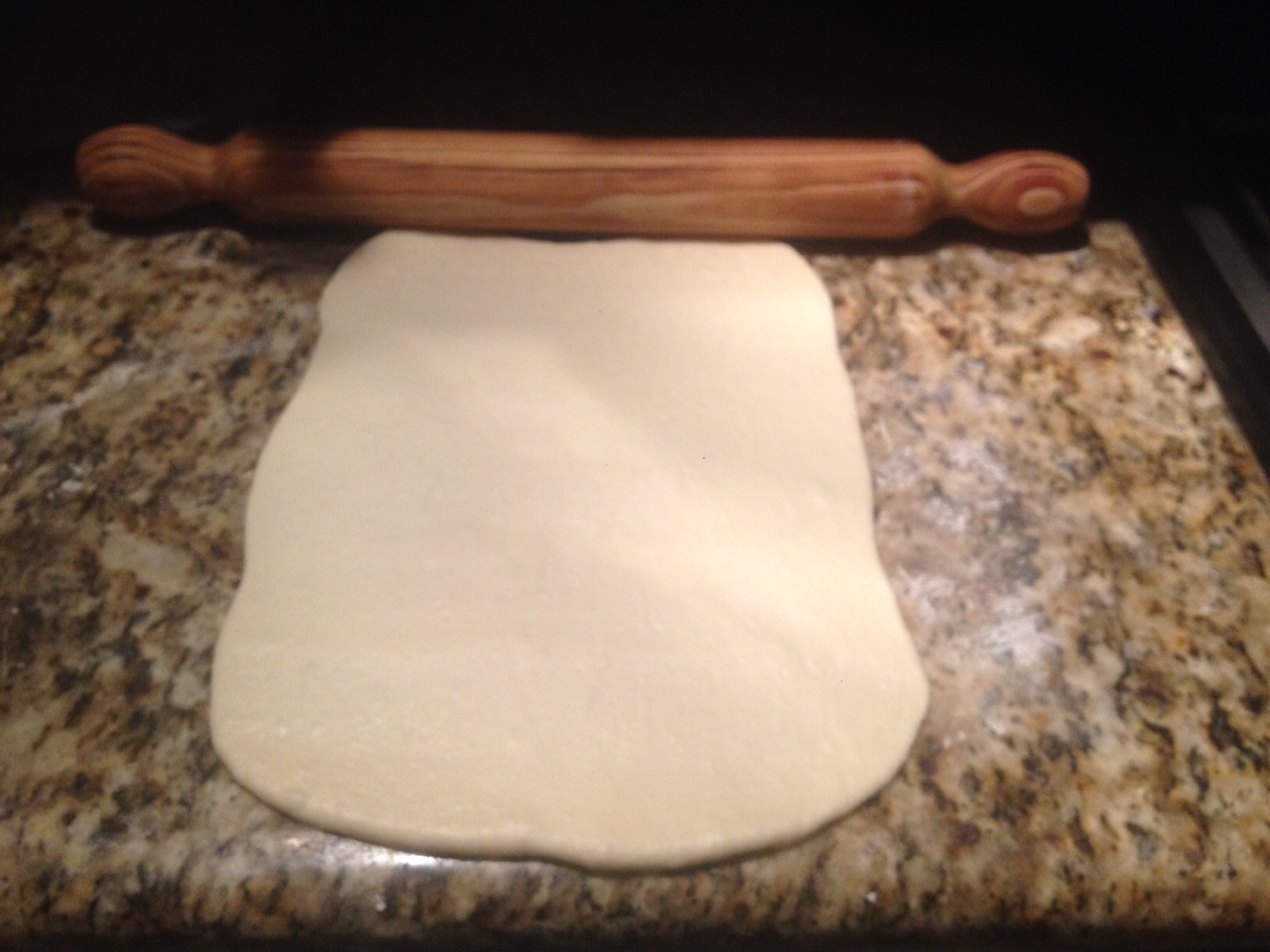 Extienda la masa en el mesón con las manos y colocoque la manteca. Amase hasta que se incorpore por completo. En inicio creerá que no se incorporará y que vas a necesitar harina, pero no es así, el truco esta en seguir amasando por 10 minutos y obtendrás una masa suave y manejable. Haga una bola, tápela con un plástico y deje reposar por 20minutos o hasta que doble su tamaño.