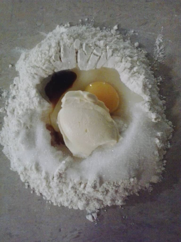 In a table or in a bowl, place the flour, butter, sugar, vanilla and eggs until a sandy mixture is obtained, take to the refrigerator wrapped with a plastic and let stand for 1 hour. Before assembling the dough in the molds, once the time has passed, place the dough in the molds and with the fingertips spread all over the edges, bake for 20 minutes.