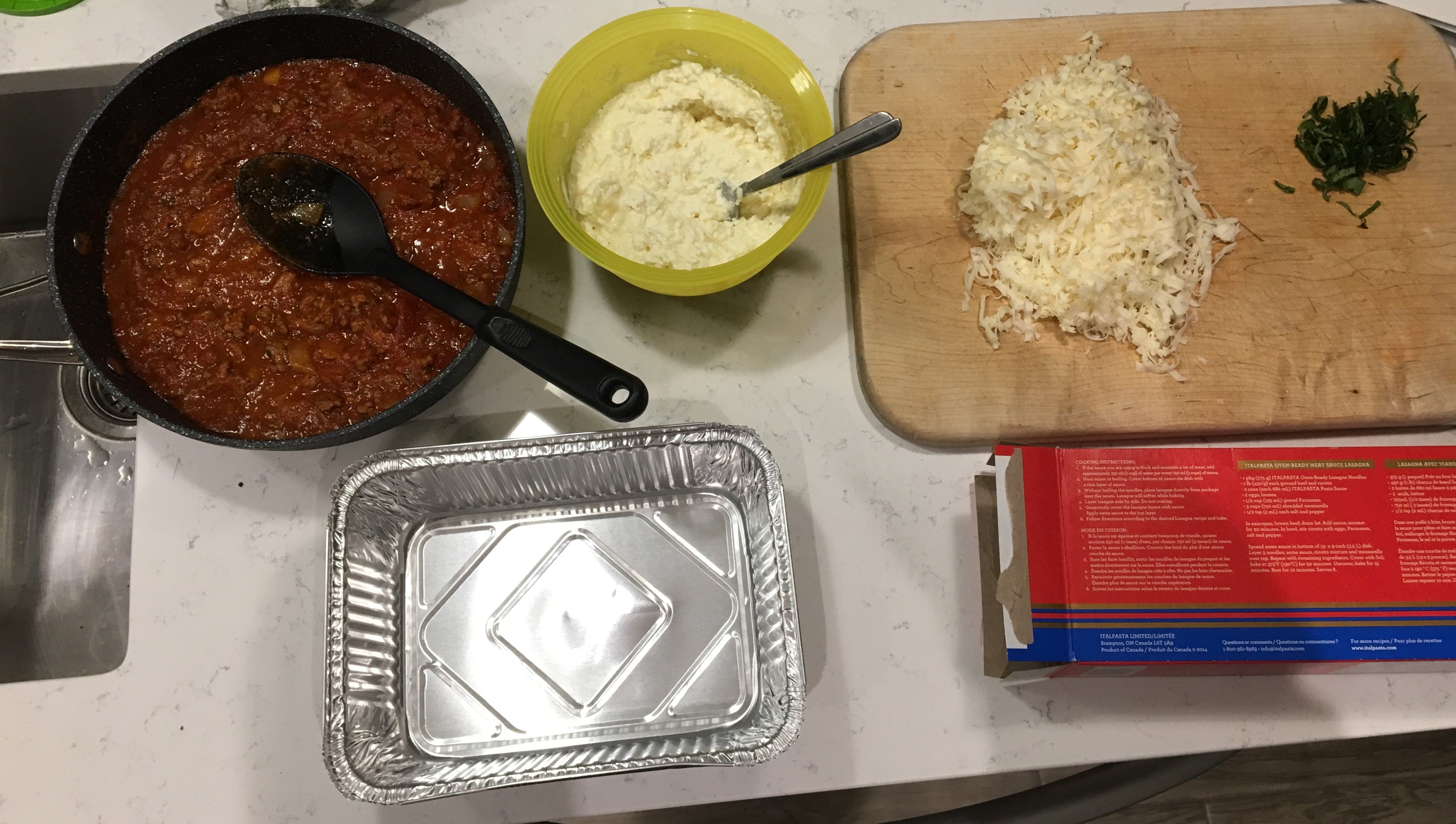 There are typically four layers in my lasagna. A tomato layer, a pasta layer, a ricotta/cottage cheese layer and shredded cheese layer. Each layer is repeated multiple times.