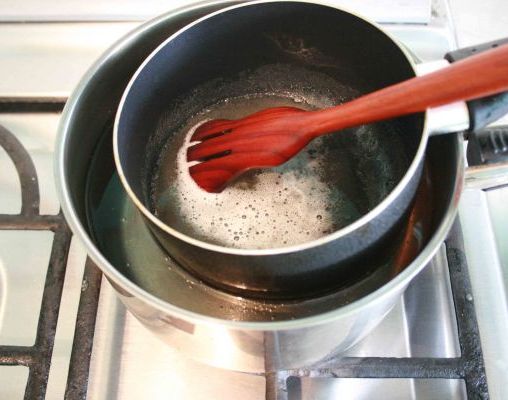 Finally, prepare the bain-marie to dilute the non-aromatized jelly. All it takes is 2 pots, one large and one small. Pour the water into the larger pot to cover 3/4 of the smaller pot. Remember, the water should never fall into the smallest pot. Stir continuously until the jelly is transparent, then the mixture is ready.