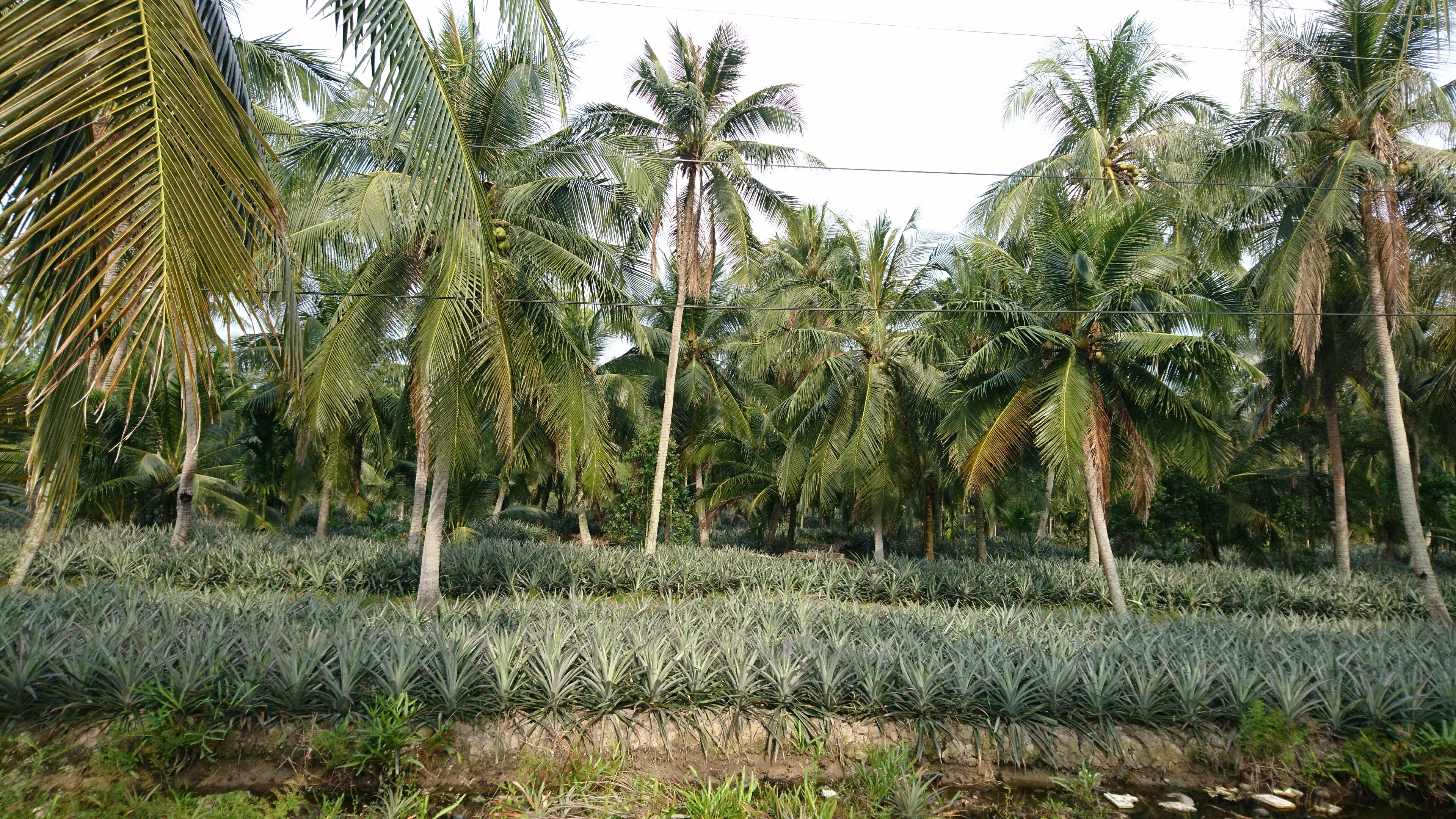 Continuing, I visited the pineapple Tắc Cậu garden. I could see a lot of coconuts.