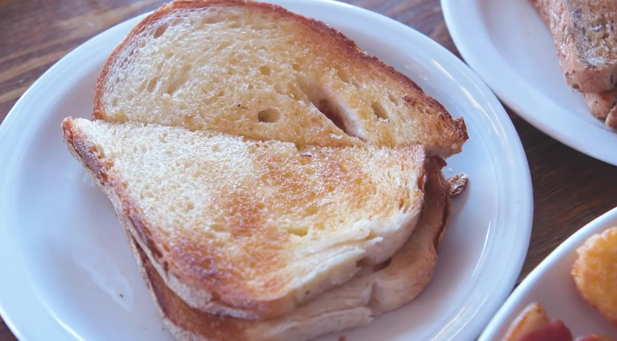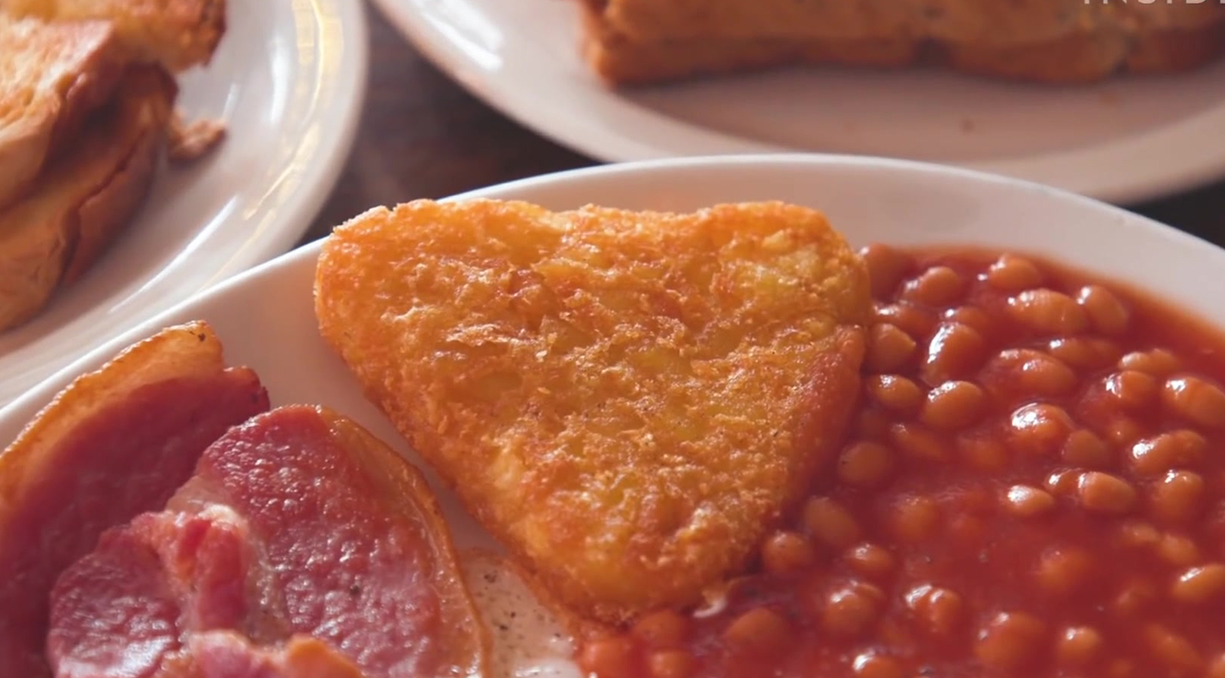 It's got fried egg in the middle. It's got some bacon. It's got some sausage, as well as just having real classics like some good pieces of toast, some beans, tomato, and a hash brown. It's nice, like the egg doesn't have too much of a hard underside to it. It hasn't been overfried.