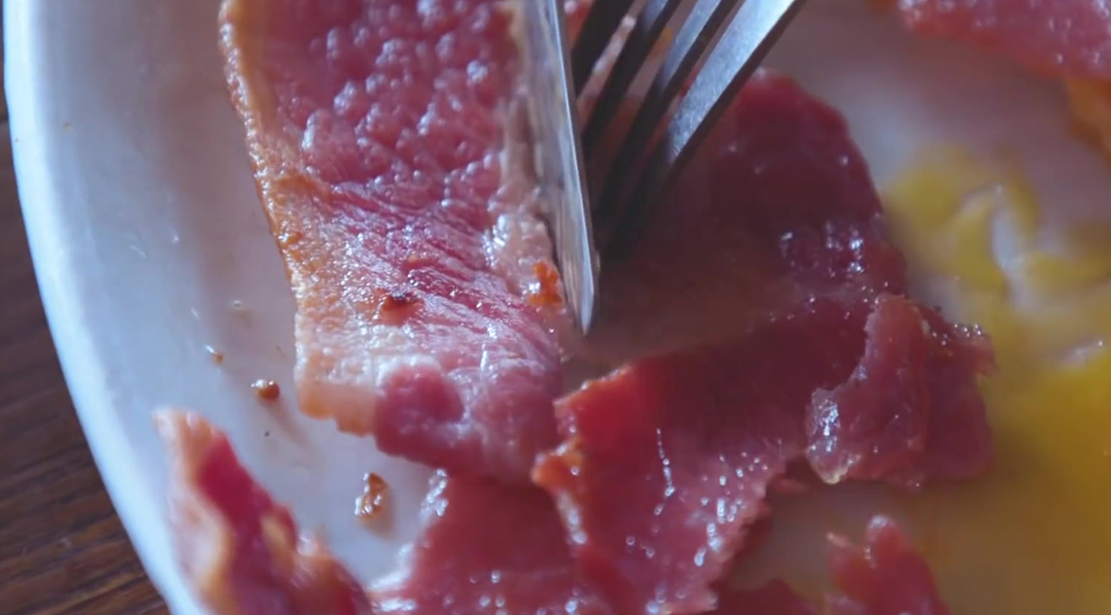 The yolk as soon as we cut into it was super, super runny, which is exactly what you wanna see in order to be able to dip in all the other elements into it. It's got a nice taste to it. It's obviously like a good, fresh, well-cooked egg. Whoa! That's good bacon.