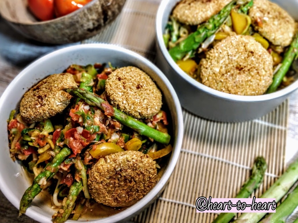 This is an oil free version so what you're seeing here is a bit on the drier side. I solved this with sauce but you can bake yours in oil or use an air fryer if you'd like! (I recommend using cold pressed/unrefined coconut or olive oil.)