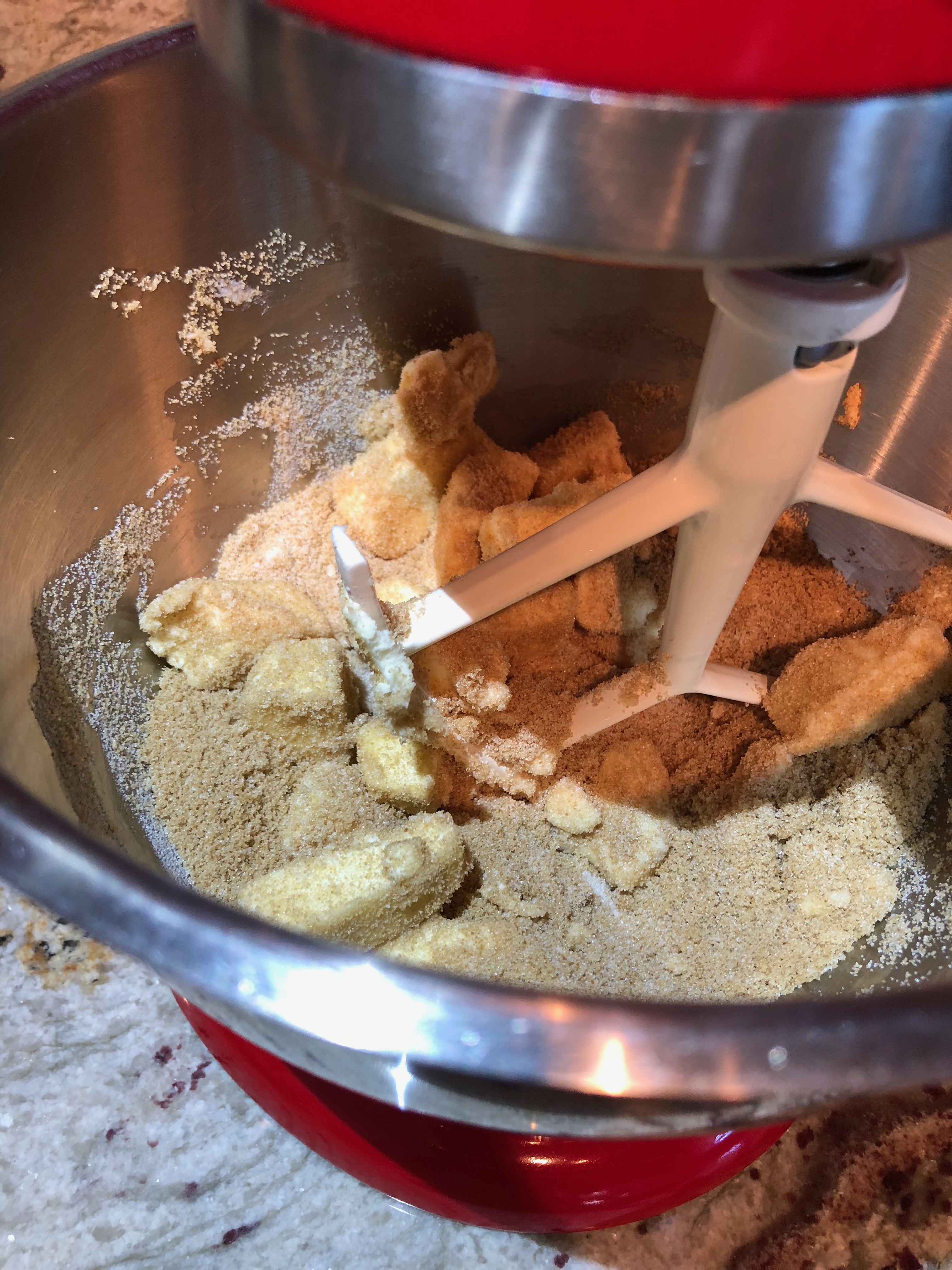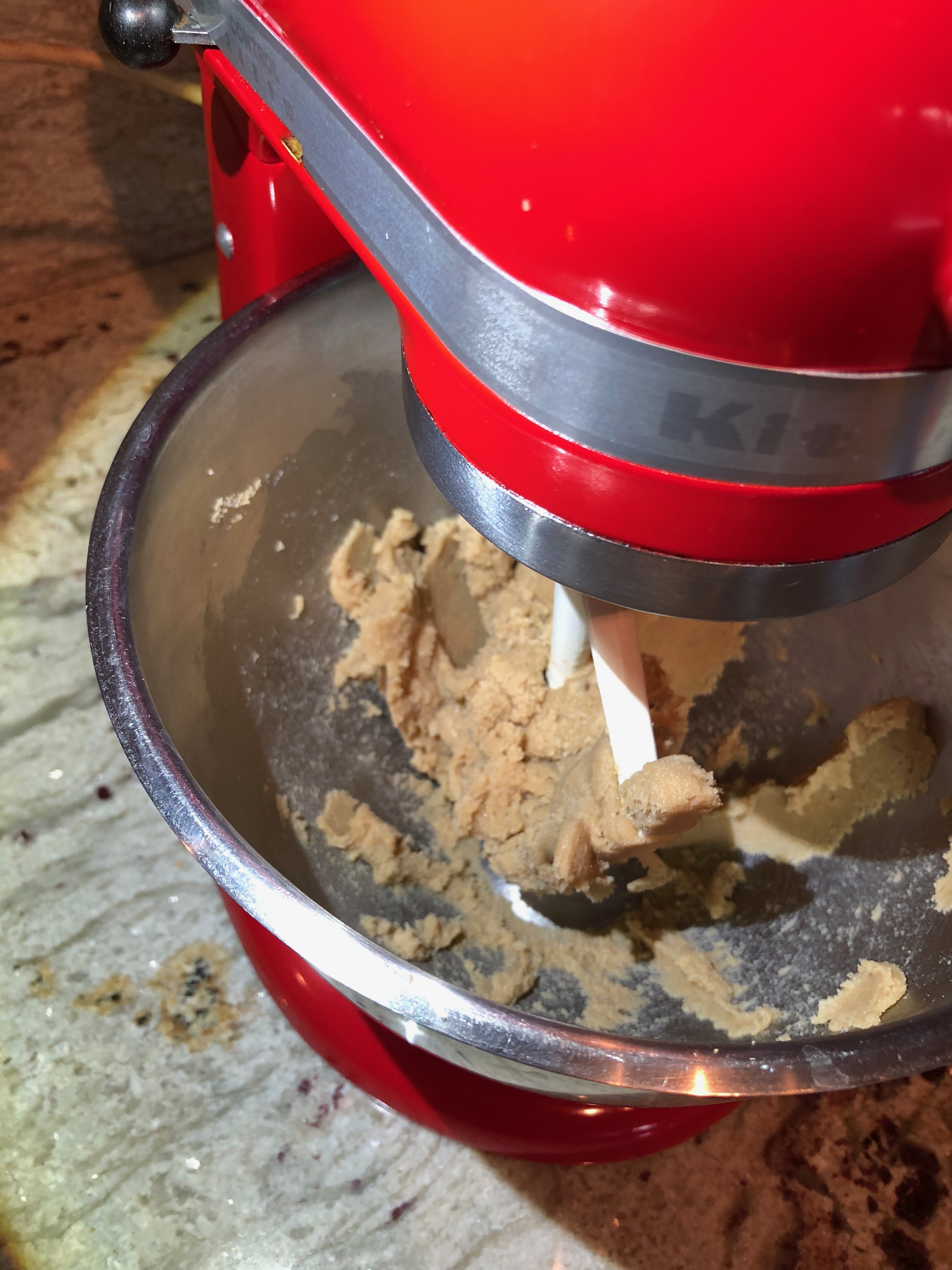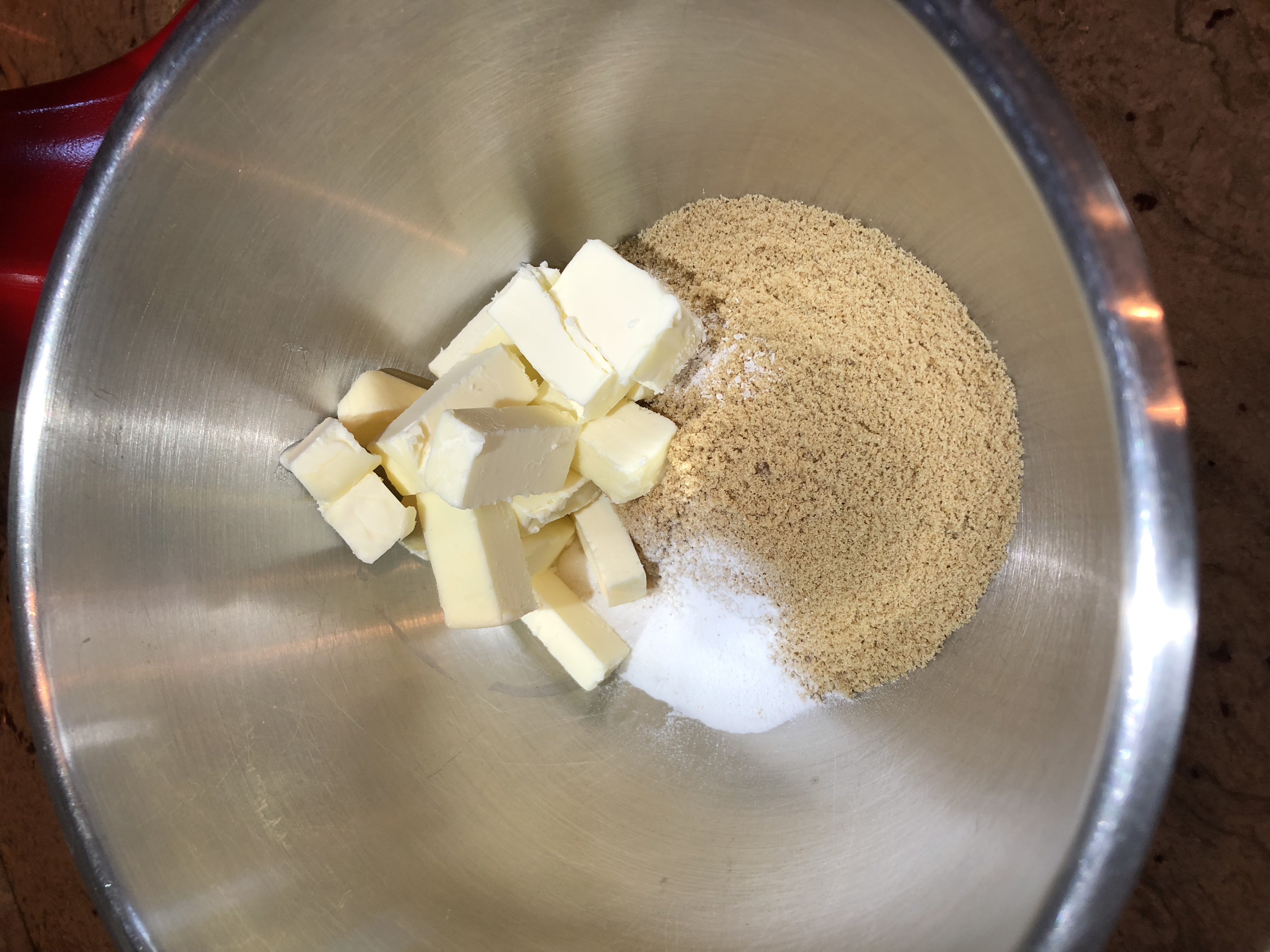 - In a mixer fitted with a paddle attachment, cream the butter, sugars, salt, baking soda and vanilla until creamy