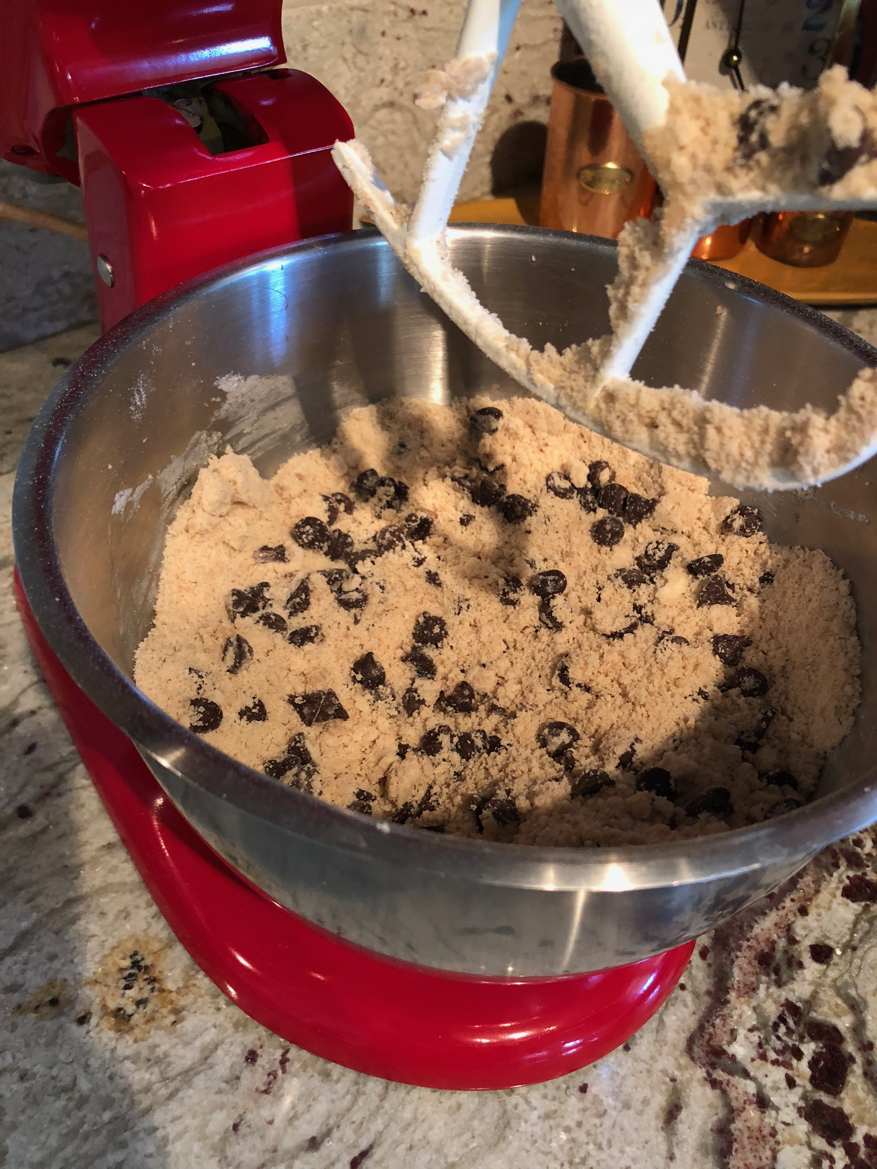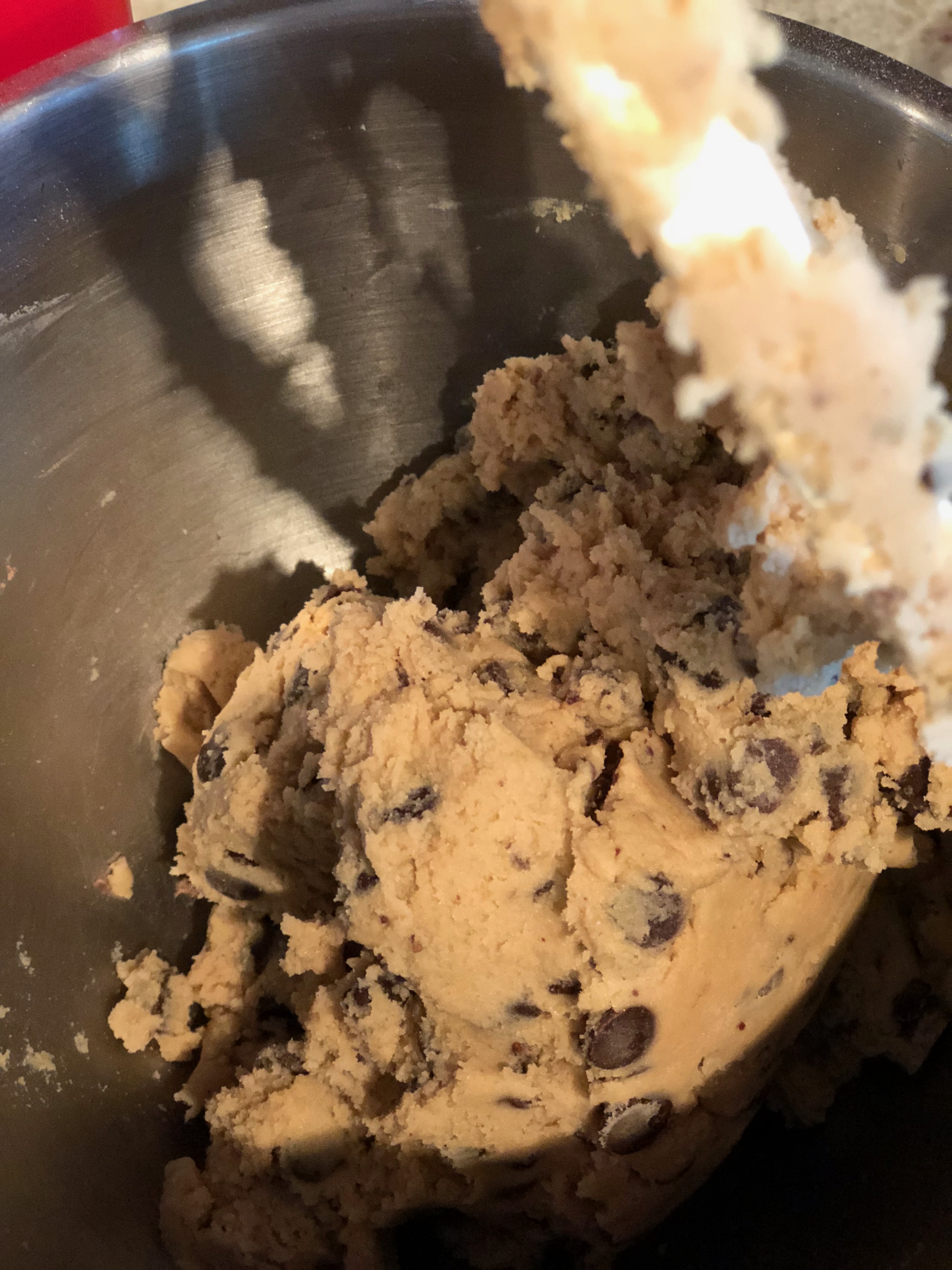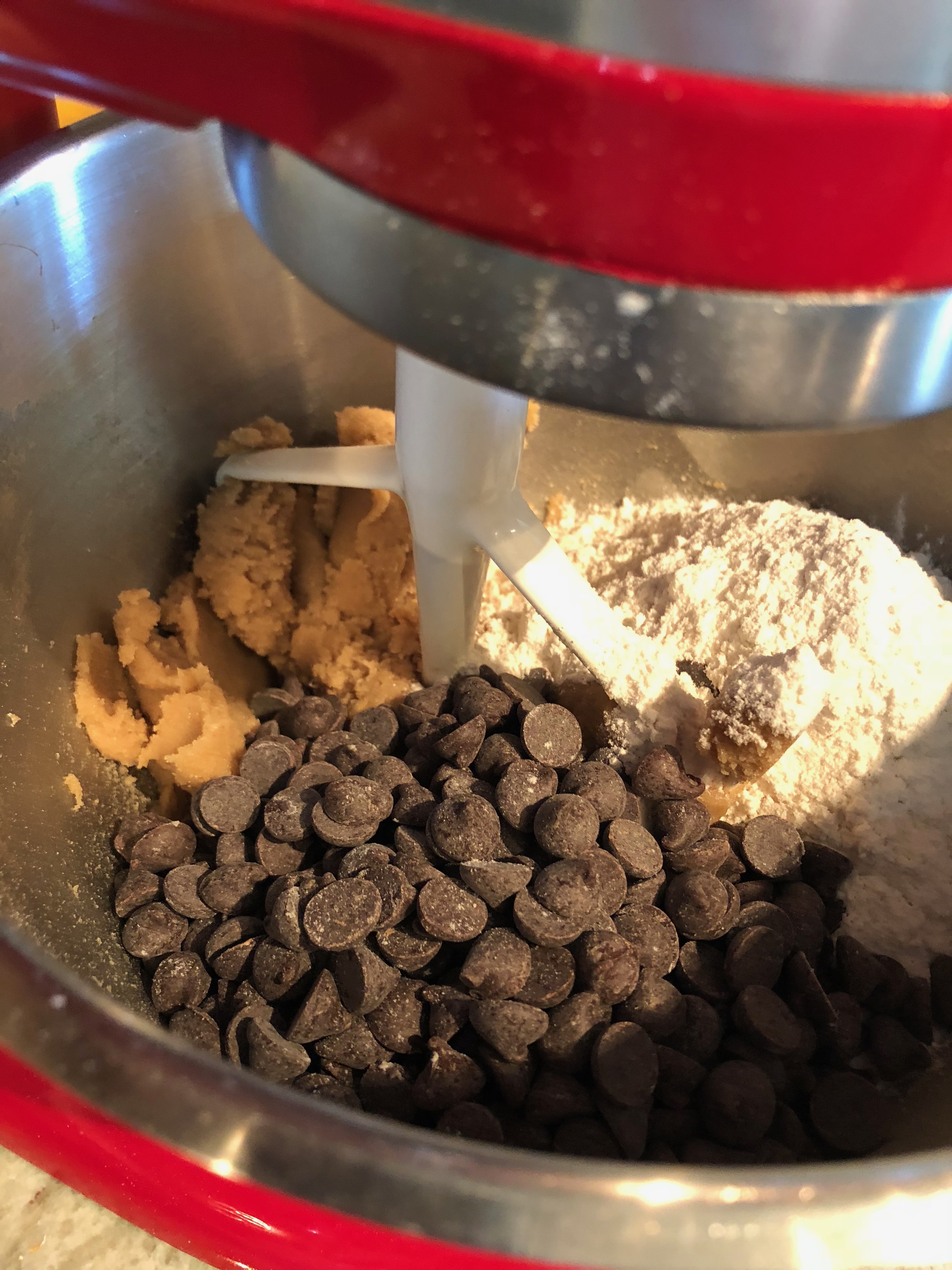 - Add the flour, chocolate chips and mix until an even, fine crumb texture