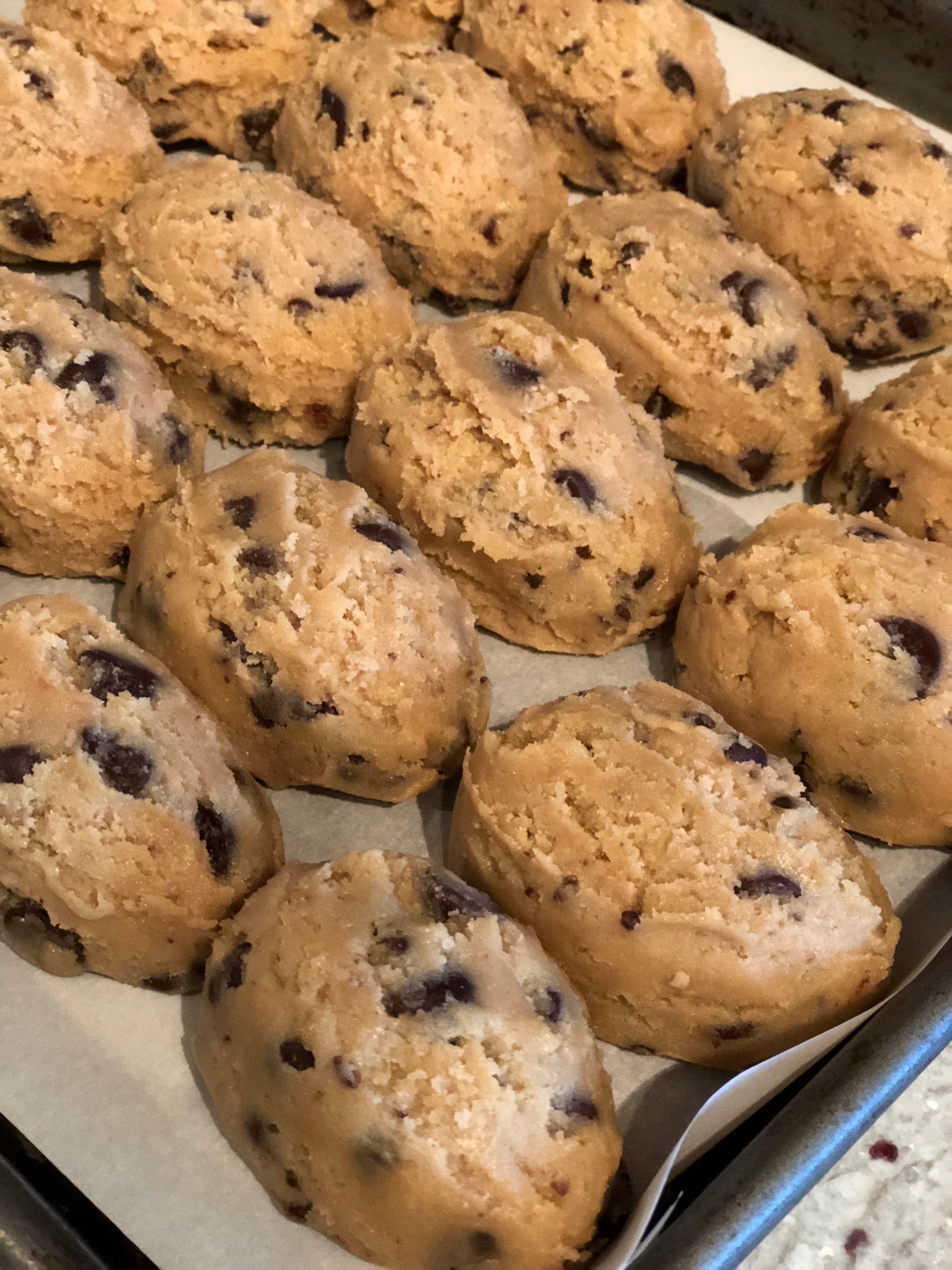 - Scoop dough into whatever size portions/cookies you desire