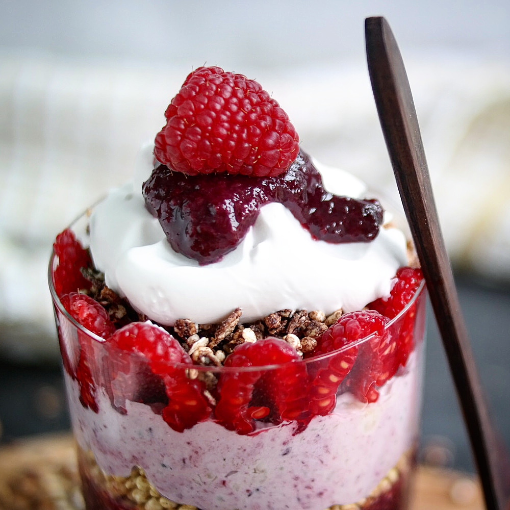 - layer of raspberries and chocolate granola,