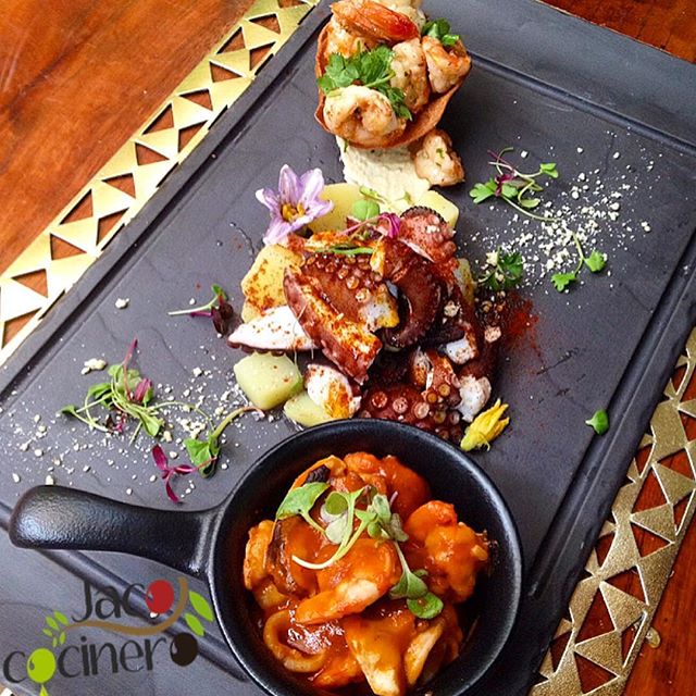 Se trata de una Tentación Mediterránea compuesta por Camarones al ajillo sobre canasta de pan pita y crema tahini, Pulpo a la gallega y Cazuela de mariscos.