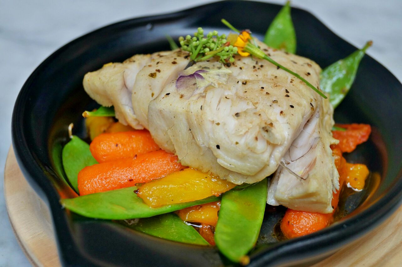 Churrasco de Mero poché en caldo de especias, sobre cama de vegetales