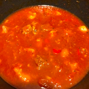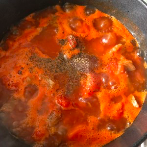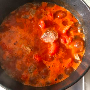 6、After tomato juice, add rock sugar, soy sauce, tomato sauce, stir well