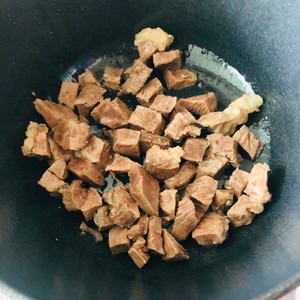 4、Put 4 grams of oil in the pot, heat the pot with cold oil, add the beef, and fry the water on the surface