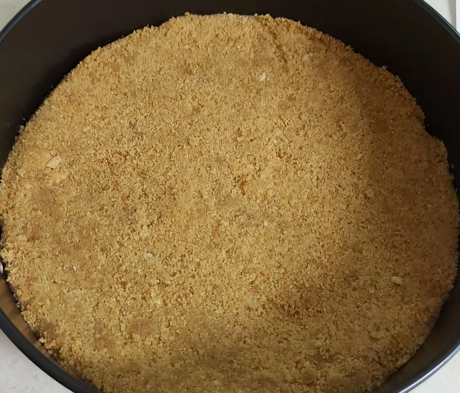 The biscuit base is very simple and quick to make, all I had to do next was to press the crumbs down into the base of the cake tin I'm using. I did this with my fingers and a spoon as it suggested.