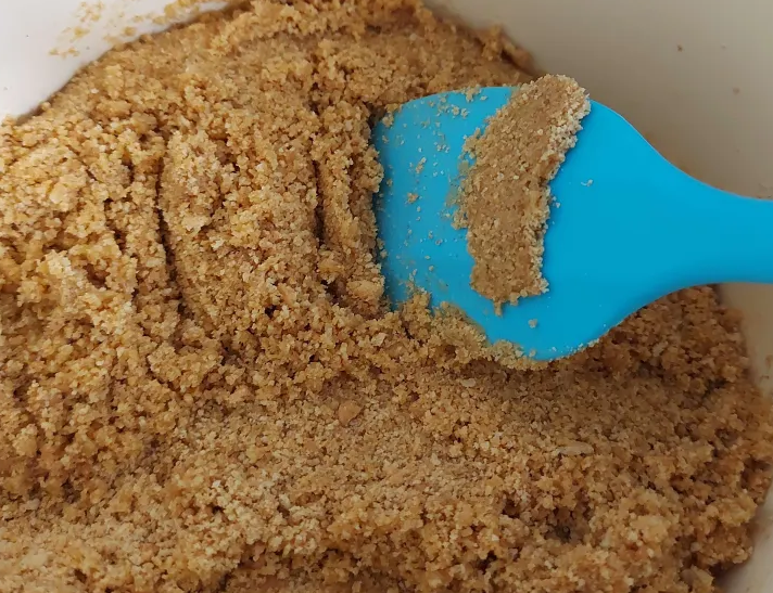 Following this, I melted the butter, and mixed it into the biscuit crumbs. I found it funny how the recipe described that it should be like "wet sand", which is definitely an accurate description, just not an appetising one!